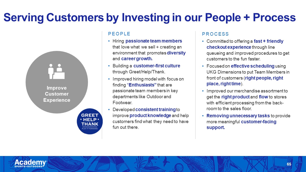 Serving Customers by Investing in our People + Process  65  PEOPLE  Hiring passionate team members that love what we sell + creating an environment that promotes diversity and career growth.  Building a customer-first culture through Greet/Help/Thank.  Improved hiring model with focus on finding “Enthusiasts” that are passionate team members in key departments like Outdoor and Footwear.  Developed consistent training to improve product knowledge and help customers find what they need to have fun out there.  PROCESS  Committed to offering a fast + friendly checkout experience through line queueing and improved procedures to get customers to the fun faster.  Focused on effective scheduling using UKG Dimensions to put Team Members in front of customers (right people, right place, right time).  Improved our merchandise assortment to get the right product and flow to stores with efficient processing from the back-room to the sales floor.  Removing unnecessary tasks to provide more meaningful customer-facing support.  Improve Customer Experience