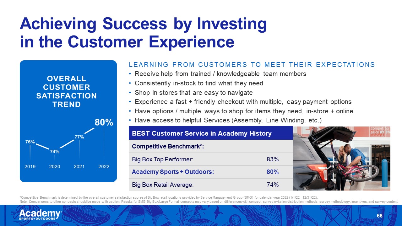 Achieving Success by Investing in the Customer Experience  66  *Competitive Benchmark is determined by the overall customer satisfaction scores of Big Box retail locations provided by Service Management Group (SMG) for calendar year 2022 (1/1/22 - 12/31/22).Note: Comparisons to other concepts should be made with caution. Results for SMG Big Box/Large Format concepts may vary based on differences with concept, survey invitation distribution methods, survey methodology, incentives, and survey content.  Learning from customers to meet their expectations  Receive help from trained / knowledgeable team members  Consistently in-stock to find what they need  Shop in stores that are easy to navigate  Experience a fast + friendly checkout with multiple, easy payment options  Have options / multiple ways to shop for items they need, in-store + online  Have access to helpful Services (Assembly, Line Winding, etc.)   BEST Customer Service in Academy History  Competitive Benchmark*:  Big Box Top Performer:                                      83%  Academy Sports + Outdoors:                80%  Big Box Retail Average:  74%