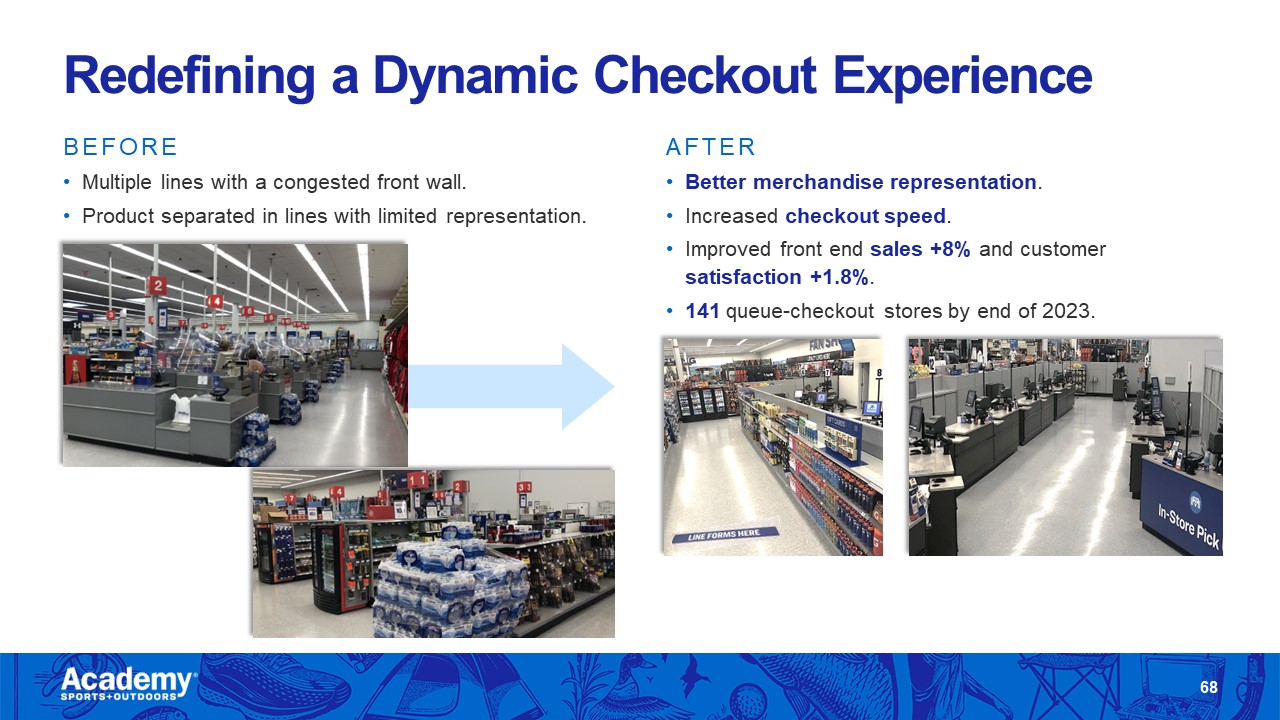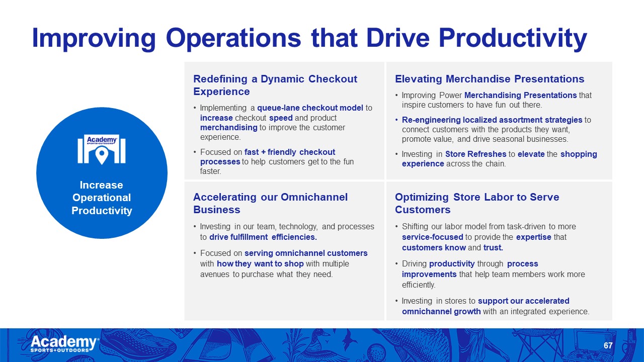 Redefining a Dynamic Checkout Experience  Implementing a queue-lane checkout model to increase checkout speed and product merchandising to improve the customer experience.  Focused on fast + friendly checkout processes to help customers get to the fun faster.  Elevating Merchandise Presentations  Improving Power Merchandising Presentations that inspire customers to have fun out there.  Re-engineering localized assortment strategies to connect customers with the products they want, promote value, and drive seasonal businesses.  Investing in Store Refreshes to elevate the shopping experience across the chain.  Accelerating our Omnichannel Business  Investing in our team, technology, and processes to drive fulfillment efficiencies.  Focused on serving omnichannel customers with how they want to shop with multiple avenues to purchase what they need.  Optimizing Store Labor to Serve Customers  Shifting our labor model from task-driven to more service-focused to provide the expertise that customers know and trust.  Driving productivity through process improvements that help team members work more efficiently.  Investing in stores to support our accelerated omnichannel growth with an integrated experience.  Improving Operations that Drive Productivity  67  Increase Operational Productivity