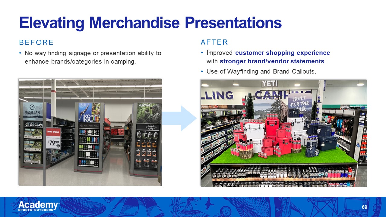 Elevating Merchandise Presentations  Before  No way finding signage or presentation ability to enhance brands/categories in camping.  69  After  Improved customer shopping experience with stronger brand/vendor statements.  Use of Wayfinding and Brand Callouts.