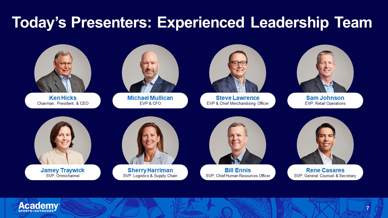 Today’s Critical Takeaways  Academy is a company positioned for growth through new store expansion, omnichannel advancements, and existing store improvements   6  One of the Best Opportunities for Sustainable Growth In Retail Today  Durable Profit Model that has Proven Resilient in Various Macro-Economic Environments   Focus on Unique Assortment, Value Offering, and Customer Experiences Differentiates Brand   Strong Balance Sheet Backed by Self-Sustaining Cash Flow Generation  Developed Multi-Year Strategic Plan to Accelerate Growth & Expand Footprint  Proven, Leading Retail Team that Transformed the Company and is now Pivoting to Growth