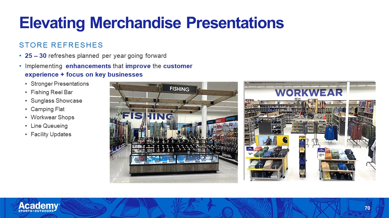Elevating Merchandise Presentations  Store Refreshes  25 – 30 refreshes planned per year going forward  Implementing enhancements that improve the customer experience + focus on key businesses  Stronger Presentations  Fishing Reel Bar  Sunglass Showcase  Camping Flat   Workwear Shops  Line Queueing  Facility Updates  70