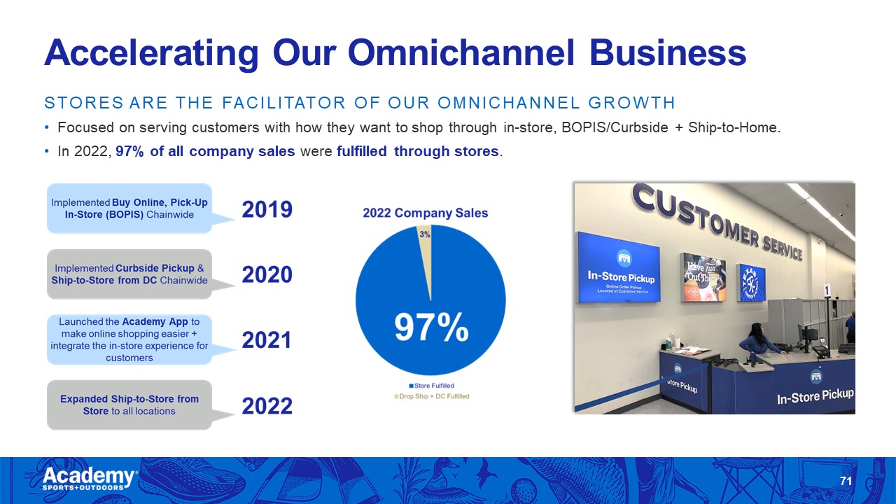 Accelerating Our Omnichannel Business  Stores are the facilitator of our Omnichannel Growth  Focused on serving customers with how they want to shop through in-store, BOPIS/Curbside + Ship-to-Home.  In 2022, 97% of all company sales were fulfilled through stores.  71
