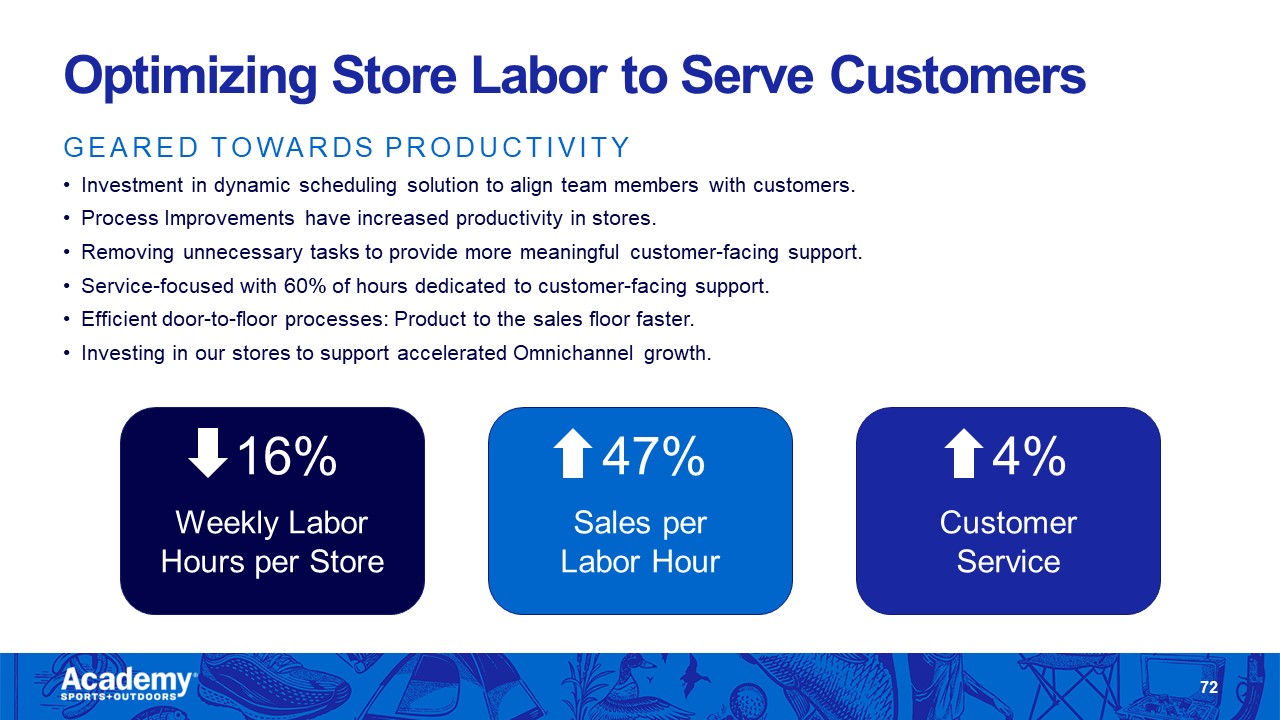 Optimizing Store Labor to Serve Customers  GEARED TOWARDS PRODUCTIVITY  Investment in dynamic scheduling solution to align team members with customers.  Process Improvements have increased productivity in stores.  Removing unnecessary tasks to provide more meaningful customer-facing support.  Service-focused with 60% of hours dedicated to customer-facing support.  Efficient door-to-floor processes: Product to the sales floor faster.  Investing in our stores to support accelerated Omnichannel growth.  72   16%  Weekly Labor Hours per Store   47%  Sales per  Labor Hour    4%  Customer  Service