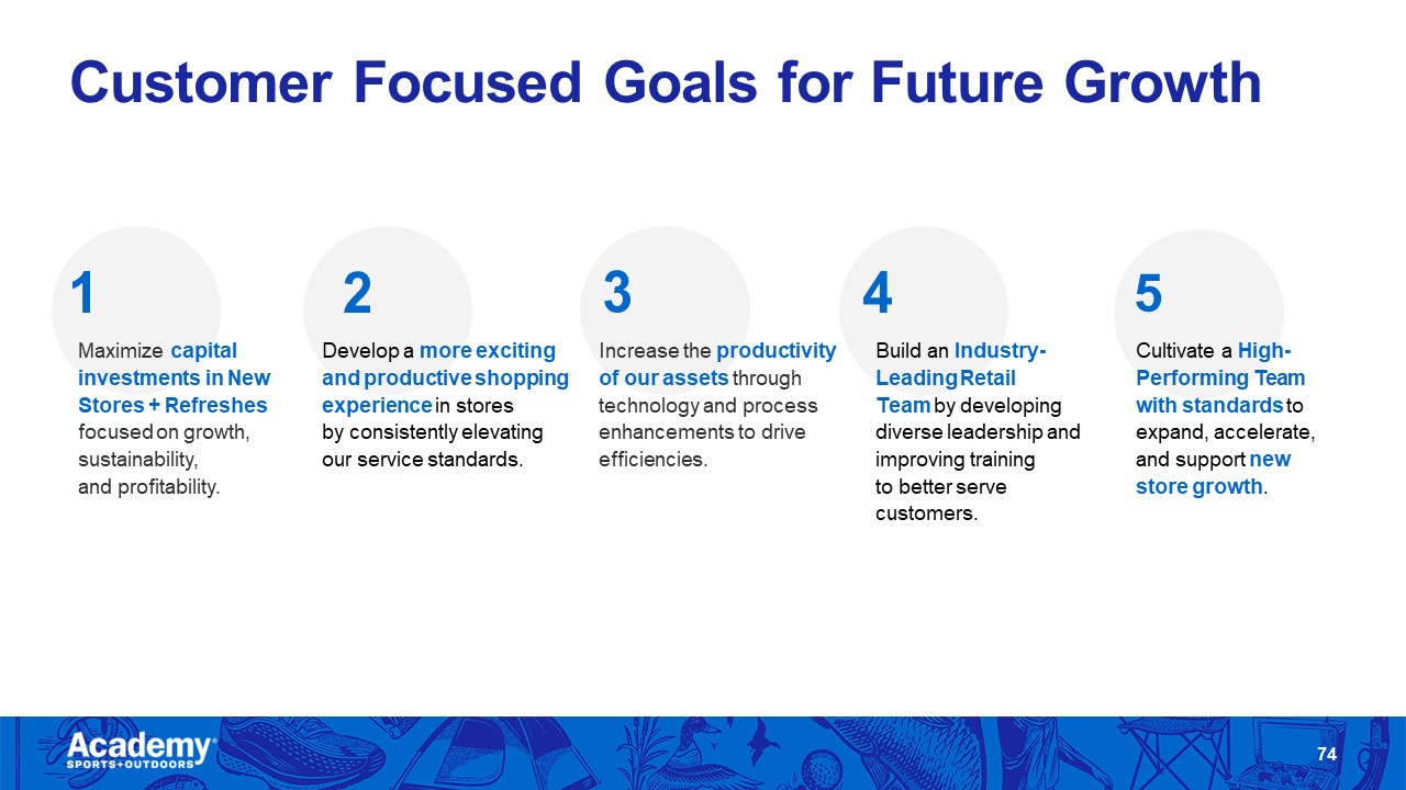 Customer Focused Goals for Future Growth  Maximize capital investments in New Stores + Refreshes   focused on growth, sustainability, and profitability.  Develop a more exciting and productive shopping experience in stores by consistently elevating our service standards.  Increase the productivity of our assets through technology and process enhancements to drive efficiencies.  Build an Industry-Leading Retail Team by developing diverse leadership and improving training to better serve customers.  Cultivate a High-Performing Team with standards to expand, accelerate, and support new store growth.   5  74