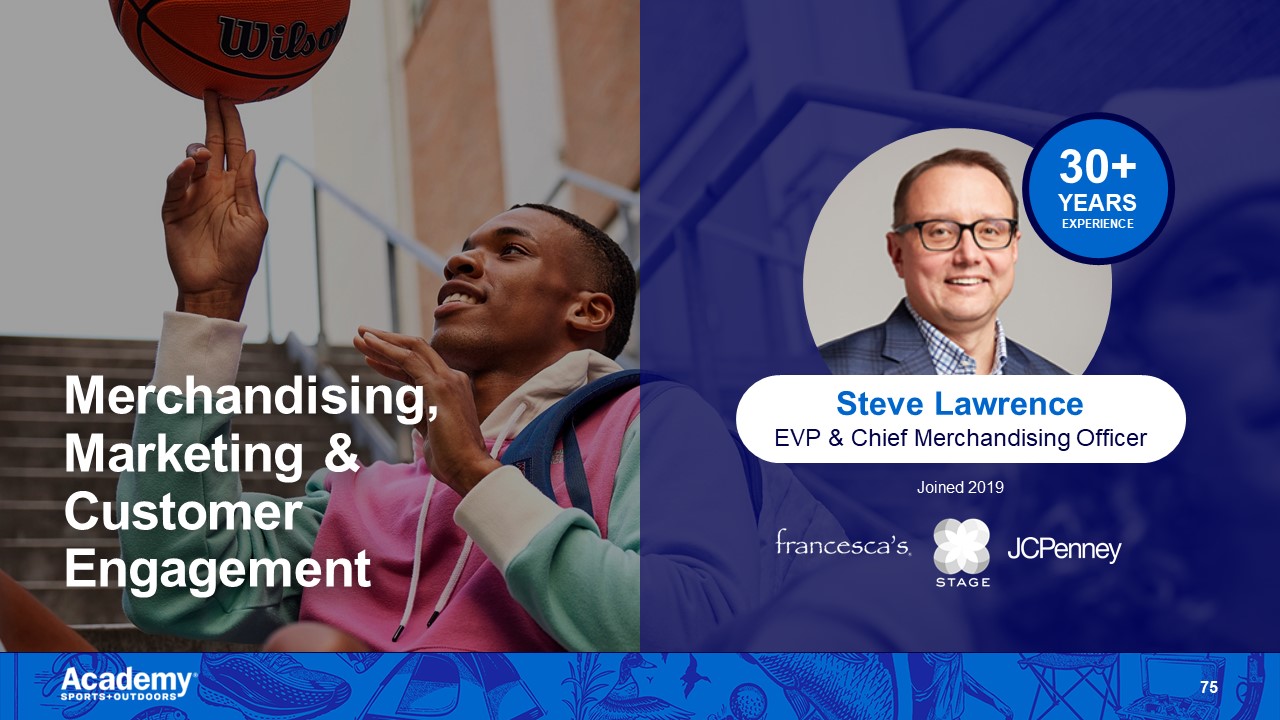 Merchandising, Marketing & Customer Engagement  75  Steve LawrenceEVP & Chief Merchandising Officer  30+  YEARSEXPERIENCE  Joined 2019