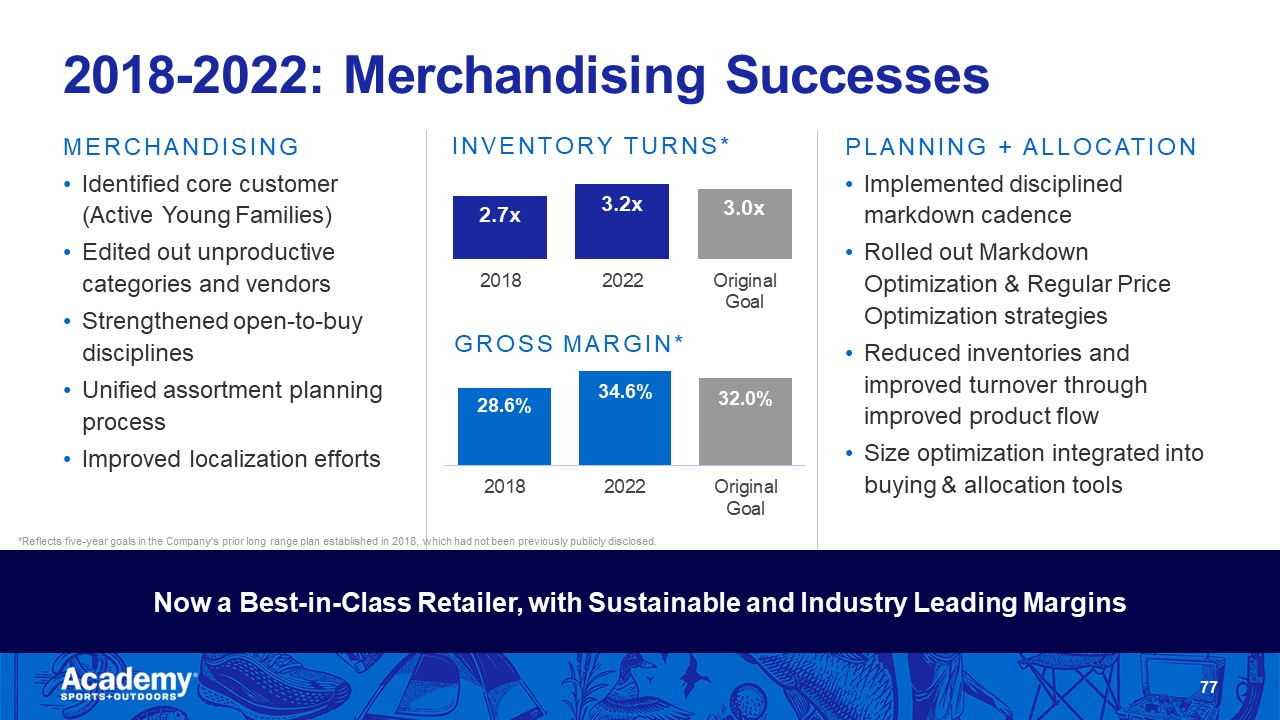 2018-2022: Merchandising Successes  MERCHANDISING  Identified core customer (Active Young Families)  Edited out unproductive categories and vendors  Strengthened open-to-buy disciplines  Unified assortment planning process  Improved localization efforts  77  Inventory Turns*  PLANNING + ALLOCATION  Implemented disciplined markdown cadence  Rolled out Markdown Optimization & Regular Price Optimization strategies  Reduced inventories and improved turnover through improved product flow  Size optimization integrated into buying & allocation tools  Now a Best-in-Class Retailer, with Sustainable and Industry Leading Margins  Gross Margin*  *Reflects five-year goals in the Company's prior long range plan established in 2018, which had not been previously publicly disclosed.