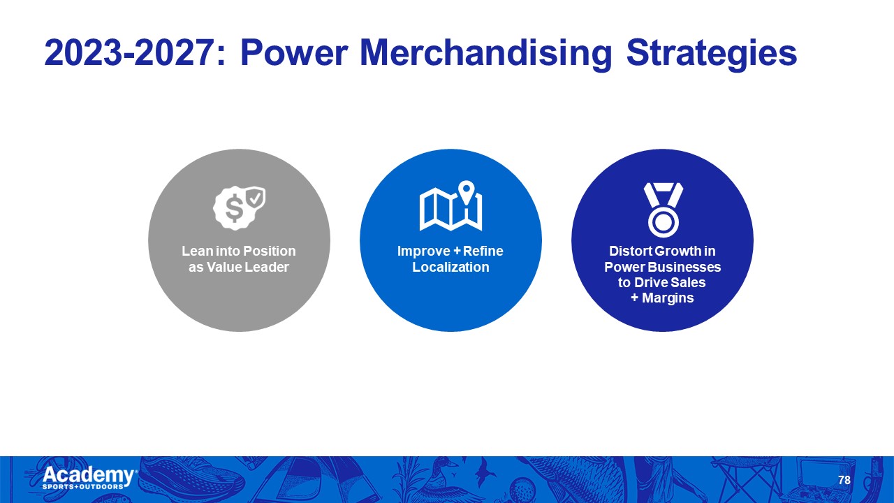 2023-2027: Power Merchandising Strategies  78  Lean into Position as Value Leader  Improve + Refine Localization  Distort Growth in Power Businesses to Drive Sales + Margins