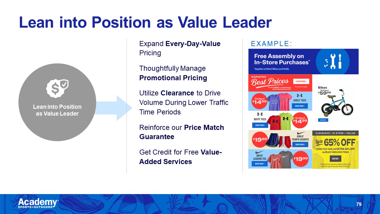 Lean into Position as Value Leader  79  Expand Every-Day-Value Pricing  Thoughtfully Manage Promotional Pricing   Utilize Clearance to Drive Volume During Lower Traffic Time Periods  Reinforce our Price Match Guarantee  Get Credit for Free Value-Added Services  EXAMPLE:  Lean into Position as Value Leader