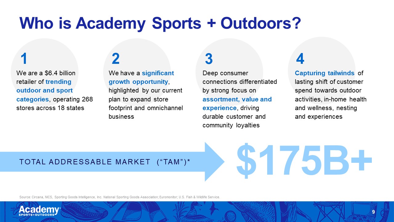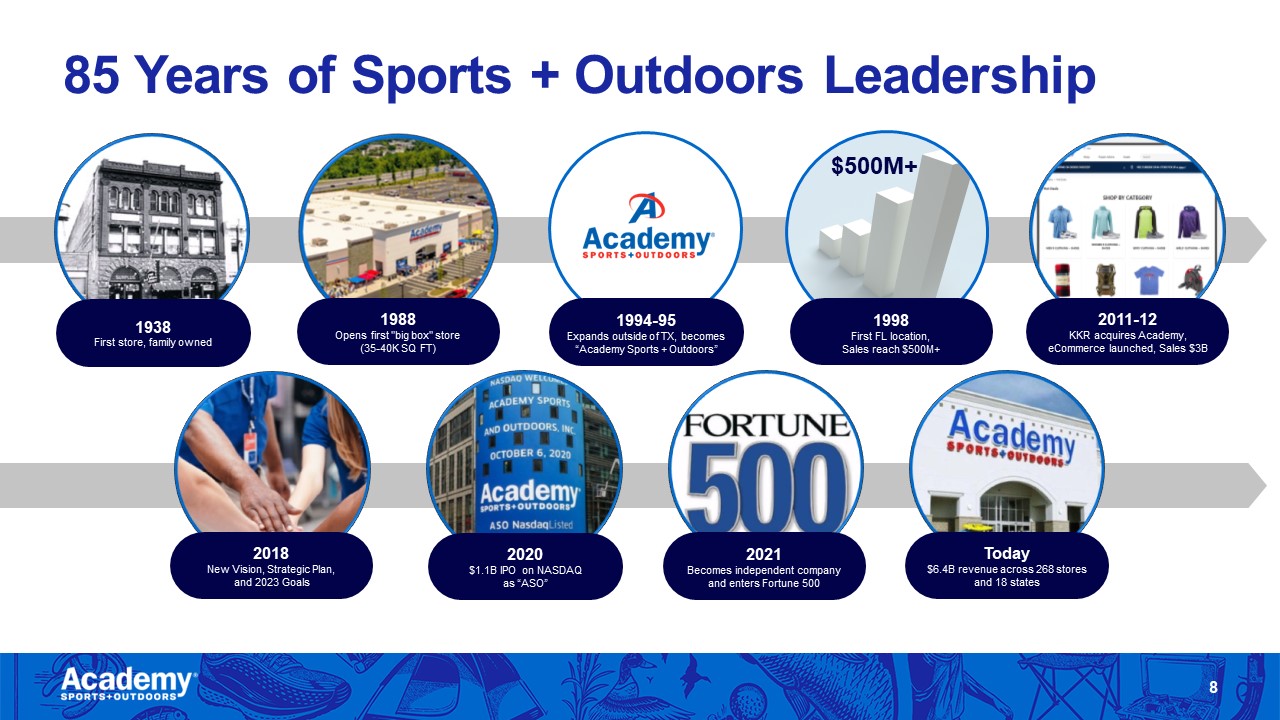 $500M+  85 Years of Sports + Outdoors Leadership  8  1938  First store, family owned  1988  Opens first "big box" store (35-40K SQ FT)  1994-95  Expands outside of TX, becomes “Academy Sports + Outdoors”  1998  First FL location, Sales reach $500M+  2011-12  KKR acquires Academy, eCommerce launched, Sales $3B  2018  New Vision, Strategic Plan, and 2023 Goals  2020  $1.1B IPO on NASDAQ as “ASO”  2021  Becomes independent company and enters Fortune 500  Today  $6.4B revenue across 268 stores and 18 states