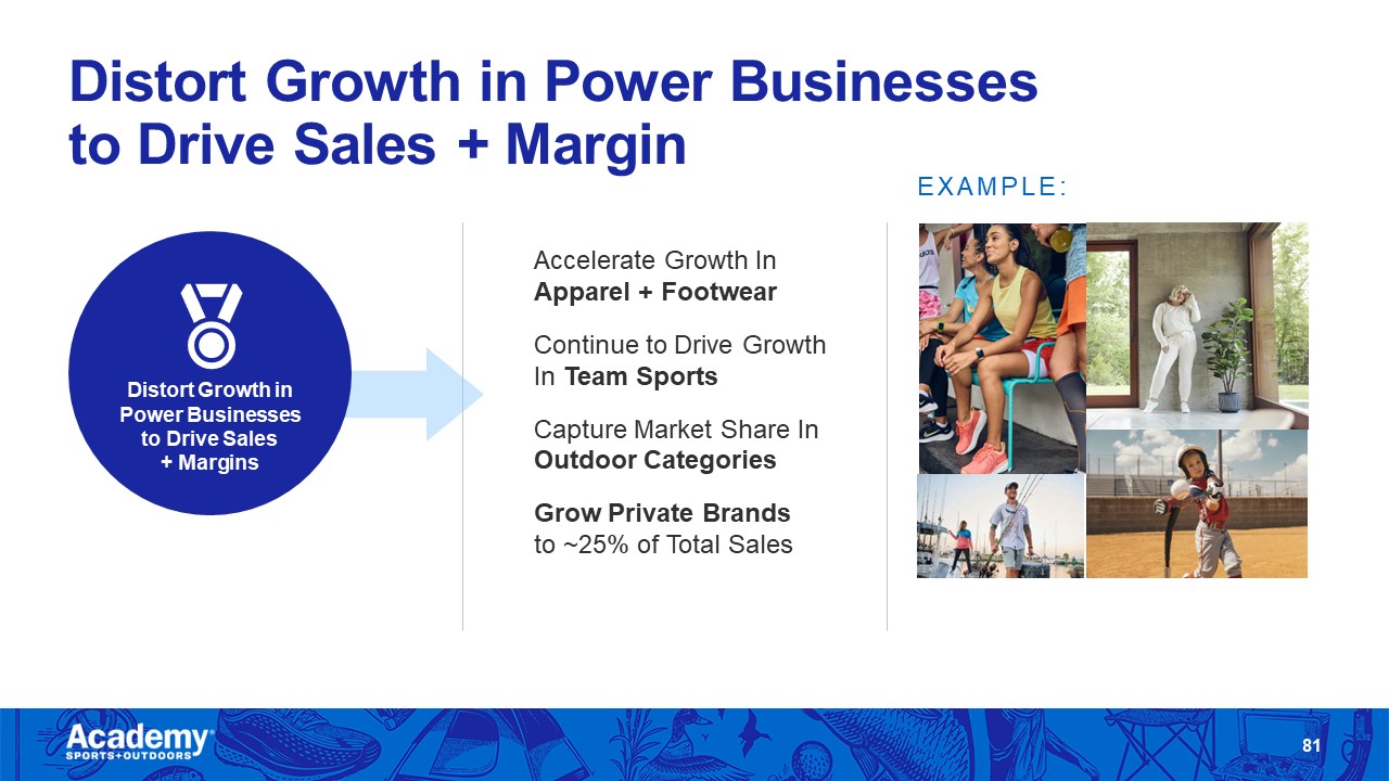 Distort Growth in Power Businesses to Drive Sales + Margin  81  Accelerate Growth In Apparel + Footwear  Continue to Drive Growth In Team Sports  Capture Market Share In Outdoor Categories  Grow Private Brands to ~25% of Total Sales  EXAMPLE:  Distort Growth in Power Businesses to Drive Sales + Margins