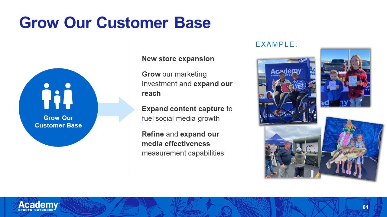Grow Our Customer Base  84  New store expansion  Grow our marketing Investment and expand our reach  Expand content capture to fuel social media growth  Refine and expand our media effectiveness measurement capabilities  EXAMPLE:  Grow Our Customer Base