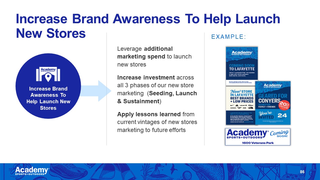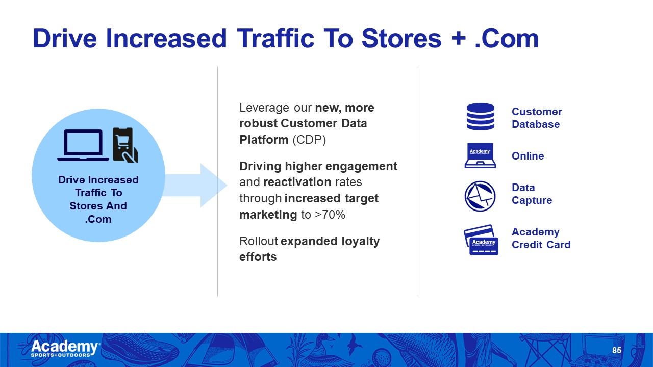 Drive Increased Traffic To Stores + .Com  85  Leverage our new, more robust Customer Data Platform (CDP)  Driving higher engagement and reactivation rates through increased target marketing to >70%  Rollout expanded loyalty efforts  Drive Increased Traffic To Stores And .Com  Customer  Database  Data  Capture  Academy  Credit Card  Online