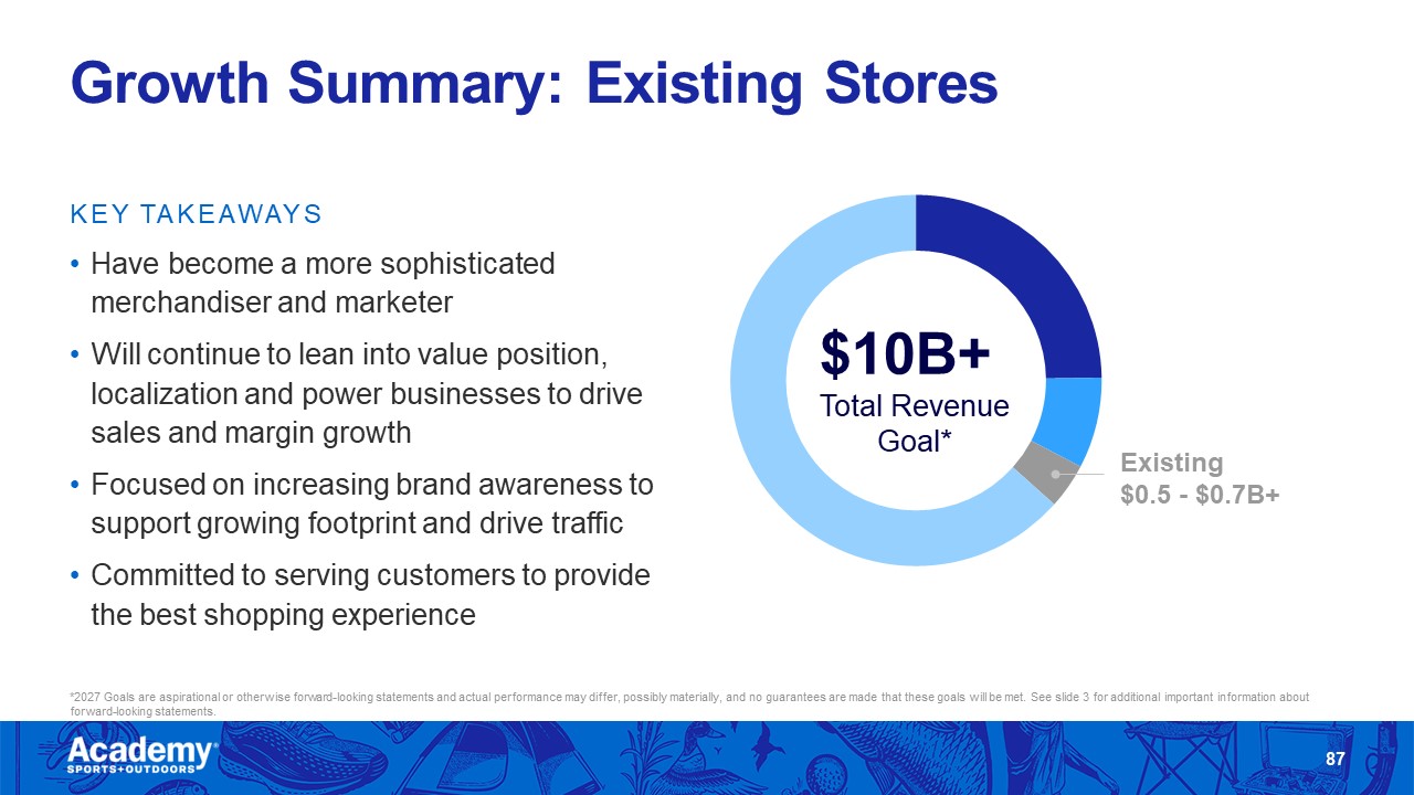 Growth Summary: Existing Stores  KEY TAKEAWAYS  Have become a more sophisticated merchandiser and marketer  Will continue to lean into value position, localization and power businesses to drive sales and margin growth  Focused on increasing brand awareness to support growing footprint and drive traffic  Committed to serving customers to provide the best shopping experience  87  $10B+   Total Revenue Goal*  Existing  $0.5 - $0.7B+  *2027 Goals are aspirational or otherwise forward-looking statements and actual performance may differ, possibly materially, and no guarantees are made that these goals will be met. See slide 3 for additional important information about forward-looking statements.