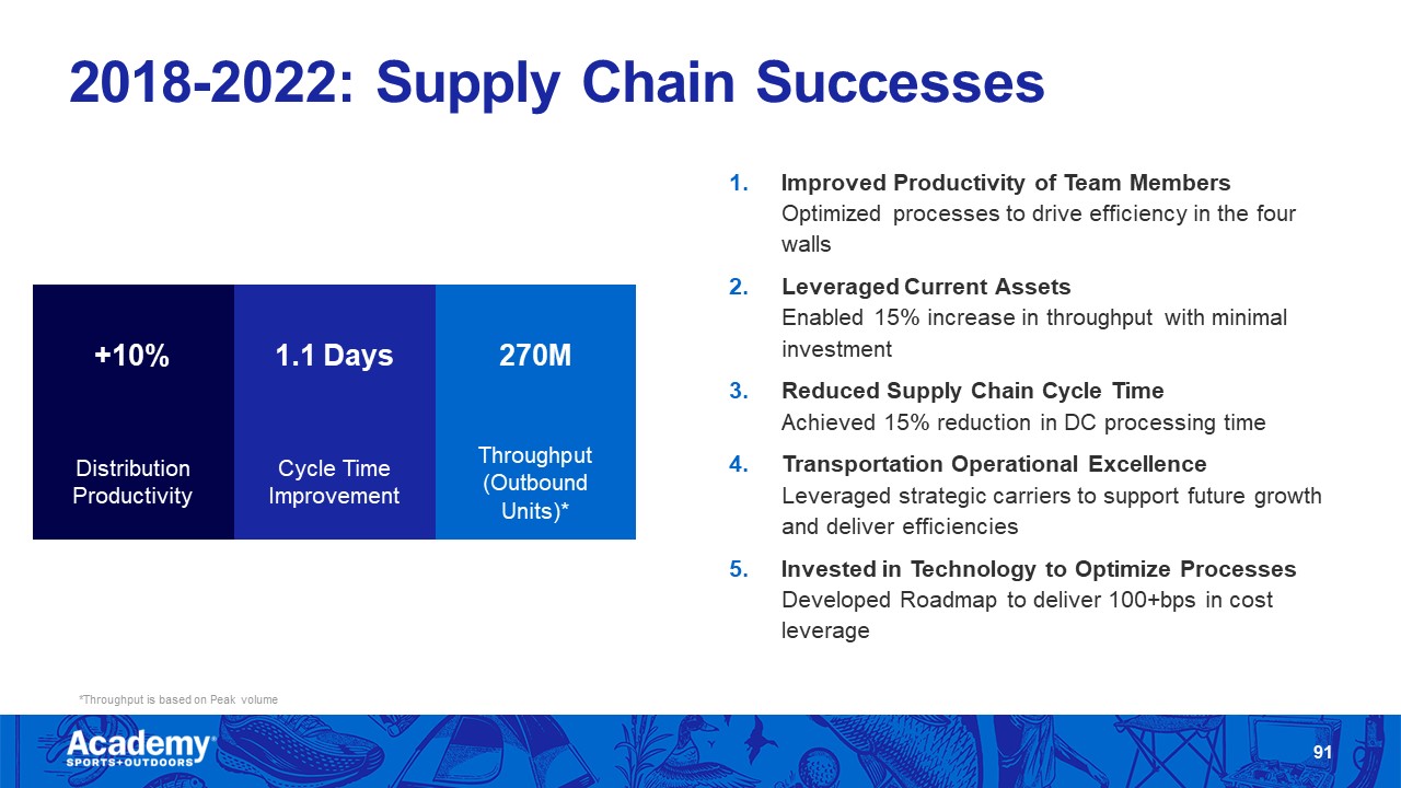 2018-2022: Supply Chain Successes  91  Improved Productivity of Team MembersOptimized processes to drive efficiency in the four walls  Leveraged Current AssetsEnabled 15% increase in throughput with minimal investment  Reduced Supply Chain Cycle Time Achieved 15% reduction in DC processing time  Transportation Operational ExcellenceLeveraged strategic carriers to support future growth and deliver efficiencies  Invested in Technology to Optimize ProcessesDeveloped Roadmap to deliver 100+bps in cost leverage  *Throughput is based on Peak volume  +10%  1.1 Days  270M  Distribution Productivity  Cycle Time Improvement  Throughput (Outbound Units)*
