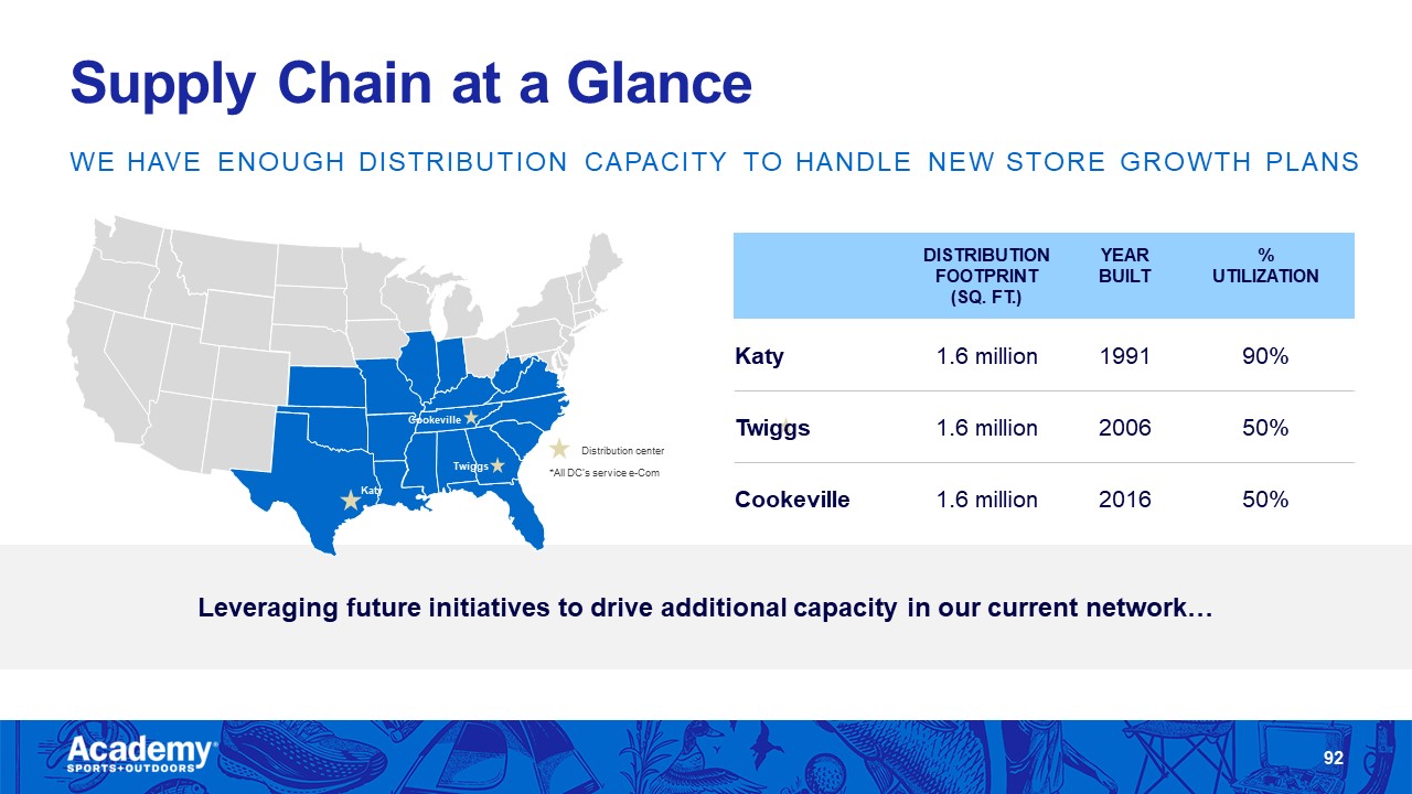 Supply Chain at a Glance  We have enough distribution capacity to handle NEW Store Growth PLANS  92  Leveraging future initiatives to drive additional capacity in our current network…  Distribution center  Twiggs  Cookeville  *All DC’s service e-Com  Katy  DISTRIBUTION FOOTPRINT (SQ. FT.)  YEAR BUILT  % UTILIZATION  Katy  1.6 million  1991  90%  Twiggs  1.6 million  2006  50%  Cookeville  1.6 million  2016  50%