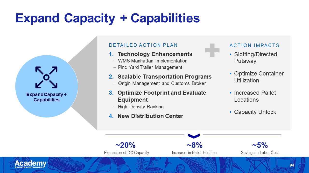 Expand Capacity + Capabilities  94  Detailed Action Plan  Technology Enhancements  WMS Manhattan Implementation  Pinc Yard Trailer Management  Scalable Transportation Programs  Origin Management and Customs Broker  Optimize Footprint and Evaluate Equipment  High Density Racking  New Distribution Center  Expand Capacity + Capabilities  Action Impacts  Slotting/Directed Putaway  Optimize Container Utilization  Increased Pallet Locations  Capacity Unlock  ~20%   Expansion of DC Capacity  ~8%  Increase in Pallet Position  ~5%  Savings in Labor Cost
