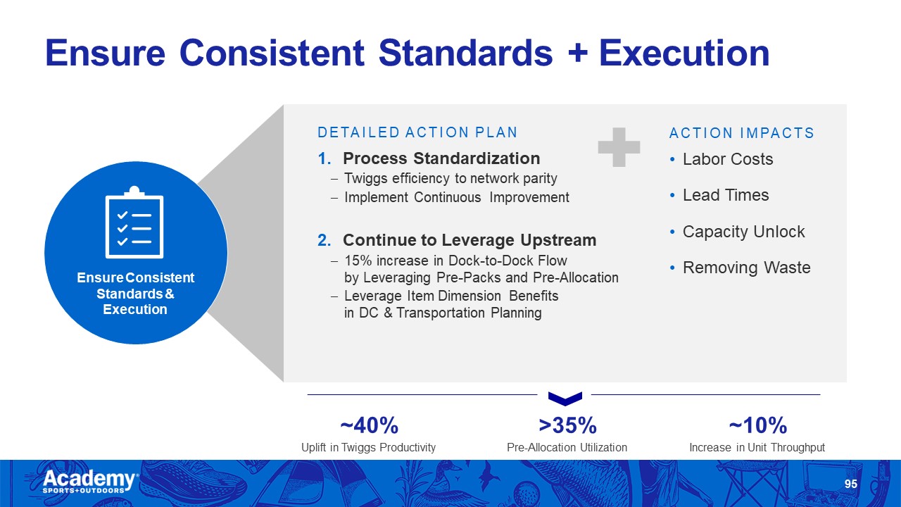 Ensure Consistent Standards + Execution  95  Detailed Action Plan  Process Standardization  Twiggs efficiency to network parity  Implement Continuous Improvement  Continue to Leverage Upstream   15% increase in Dock-to-Dock Flow by Leveraging Pre-Packs and Pre-Allocation  Leverage Item Dimension Benefits in DC & Transportation Planning  Action Impacts  Labor Costs  Lead Times  Capacity Unlock  Removing Waste  Ensure Consistent Standards & Execution  ~40%   Uplift in Twiggs Productivity  >35%  Pre-Allocation Utilization  ~10%  Increase in Unit Throughput