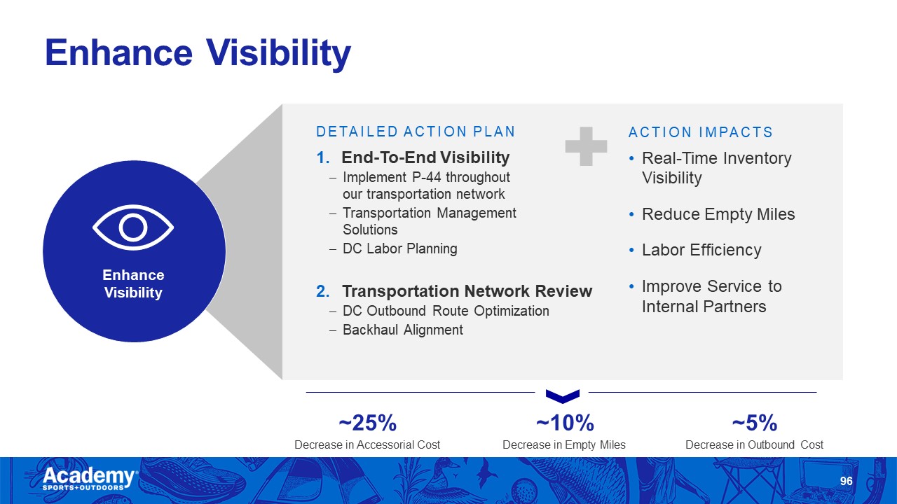 Enhance Visibility  96  Detailed Action Plan  End-To-End Visibility  Implement P-44 throughout our transportation network  Transportation Management Solutions   DC Labor Planning  Transportation Network Review  DC Outbound Route Optimization  Backhaul Alignment  Enhance Visibility  Action Impacts  Real-Time Inventory Visibility  Reduce Empty Miles  Labor Efficiency  Improve Service to Internal Partners  ~25%   Decrease in Accessorial Cost  ~10%  Decrease in Empty Miles  ~5%  Decrease in Outbound Cost