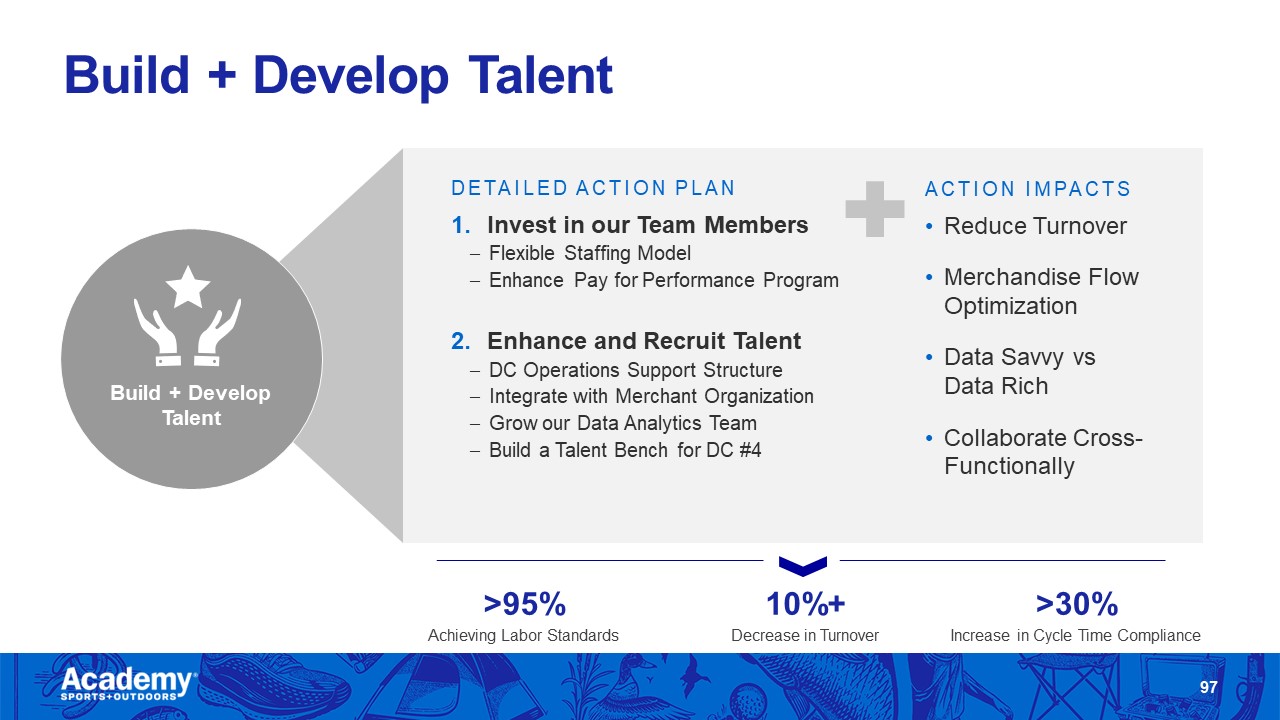 Detailed Action Plan  Invest in our Team Members  Flexible Staffing Model  Enhance Pay for Performance Program  Enhance and Recruit Talent   DC Operations Support Structure  Integrate with Merchant Organization  Grow our Data Analytics Team  Build a Talent Bench for DC #4  Build + Develop Talent  97  Action Impacts  Reduce Turnover  Merchandise Flow Optimization  Data Savvy vs Data Rich  Collaborate Cross-Functionally  Build + Develop Talent  >95%   Achieving Labor Standards  10%+  Decrease in Turnover  >30%  Increase in Cycle Time Compliance