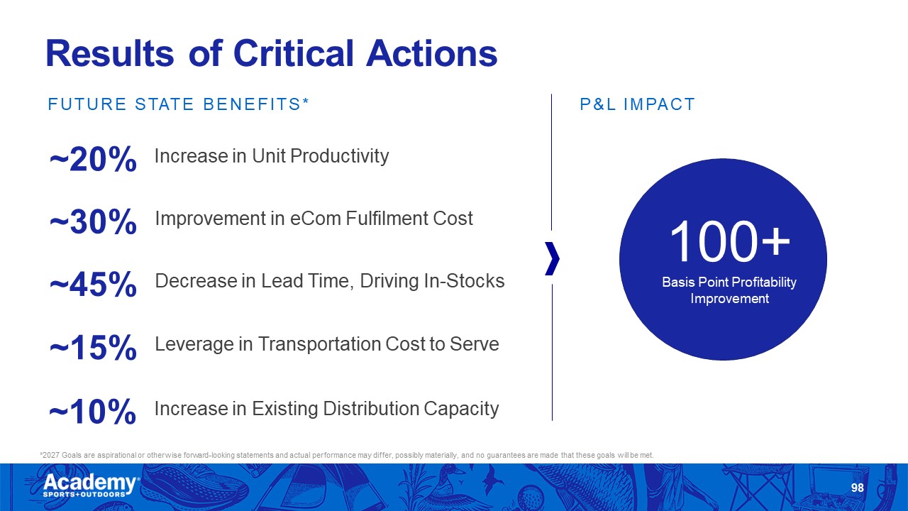 Results of Critical Actions  98  Future State Benefits*  ~20%  Increase in Unit Productivity  ~30%  Improvement in eCom Fulfilment Cost  ~45%  Decrease in Lead Time, Driving In-Stocks  ~15%  Leverage in Transportation Cost to Serve    P&L Impact  100+   Basis Point Profitability Improvement  ~10%  Increase in Existing Distribution Capacity    *2027 Goals are aspirational or otherwise forward-looking statements and actual performance may differ, possibly materially, and no guarantees are made that these goals will be met.