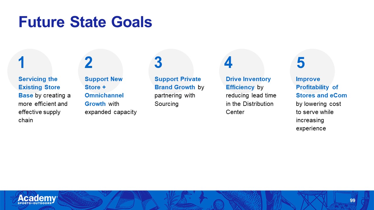 Future State Goals  99  Servicing the Existing Store Base by creating a more efficient and effective supply chain  Support New Store + Omnichannel Growth with expanded capacity  Support Private Brand Growth by partnering with Sourcing  Drive Inventory Efficiency by reducing lead time in the Distribution Center  Improve Profitability of Stores and eCom by lowering cost to serve while increasing experience  5
