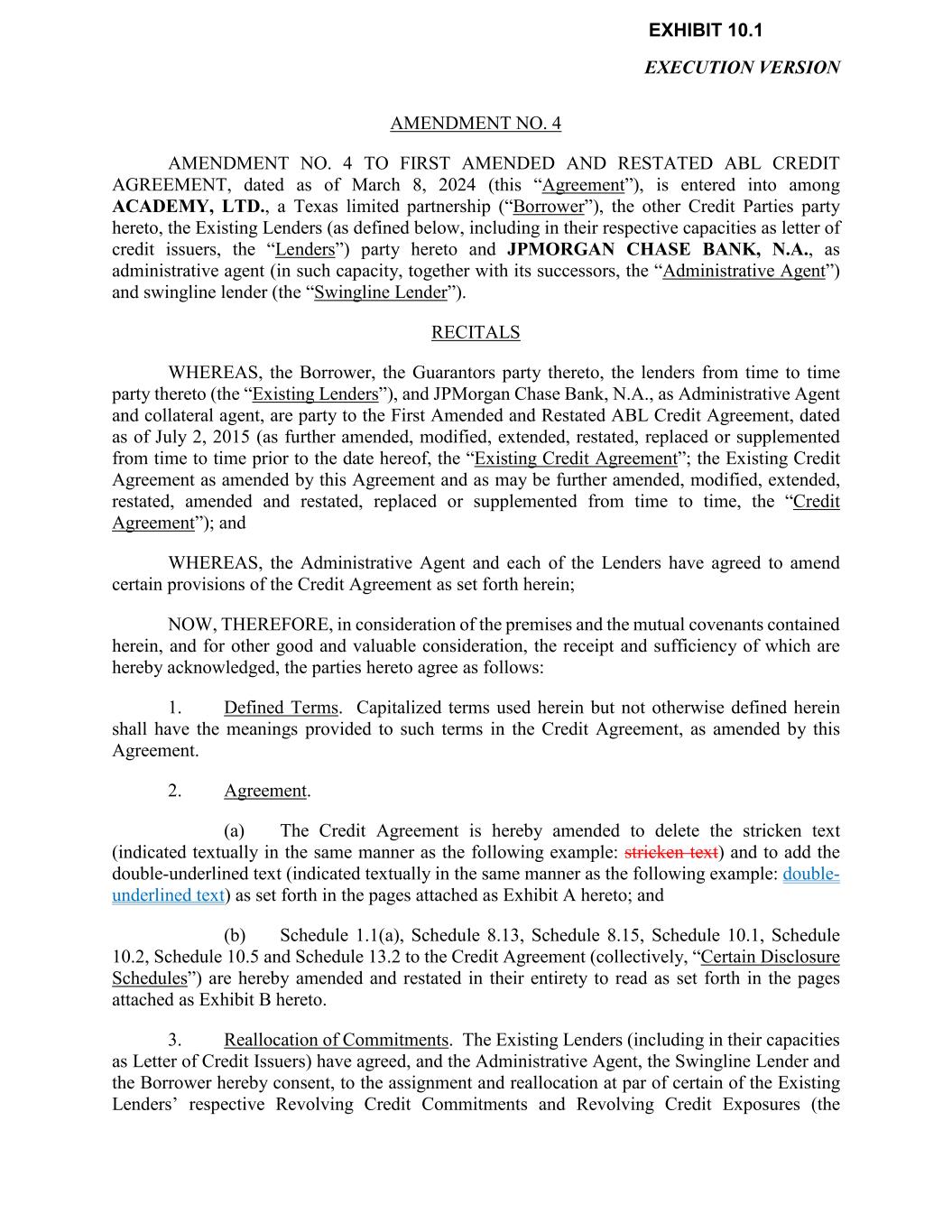 AMENDMENT NO. 4 AMENDMENT NO. 4 TO FIRST AMENDED AND RESTATED ABL CREDIT AGREEMENT, dated as of March 8, 2024 (this “Agreement”), is entered into among ACADEMY, LTD., a Texas limited partnership (“Borrower”), the other Credit Parties party hereto, the Existing Lenders (as defined below, including in their respective capacities as letter of credit issuers, the “Lenders”) party hereto and JPMORGAN CHASE BANK, N.A., as administrative agent (in such capacity, together with its successors, the “Administrative Agent”) and swingline lender (the “Swingline Lender”). RECITALS WHEREAS, the Borrower, the Guarantors party thereto, the lenders from time to time party thereto (the “Existing Lenders”), and JPMorgan Chase Bank, N.A., as Administrative Agent and collateral agent, are party to the First Amended and Restated ABL Credit Agreement, dated as of July 2, 2015 (as further amended, modified, extended, restated, replaced or supplemented from time to time prior to the date hereof, the “Existing Credit Agreement”; the Existing Credit Agreement as amended by this Agreement and as may be further amended, modified, extended, restated, amended and restated, replaced or supplemented from time to time, the “Credit Agreement”); and WHEREAS, the Administrative Agent and each of the Lenders have agreed to amend certain provisions of the Credit Agreement as set forth herein; NOW, THEREFORE, in consideration of the premises and the mutual covenants contained herein, and for other good and valuable consideration, the receipt and sufficiency of which are hereby acknowledged, the parties hereto agree as follows: 1. Defined Terms. Capitalized terms used herein but not otherwise defined herein shall have the meanings provided to such terms in the Credit Agreement, as amended by this Agreement. 2. Agreement. (a) The Credit Agreement is hereby amended to delete the stricken text (indicated textually in the same manner as the following example: stricken text) and to add the double-underlined text (indicated textually in the same manner as the following example: double- underlined text) as set forth in the pages attached as Exhibit A hereto; and (b) Schedule 1.1(a), Schedule 8.13, Schedule 8.15, Schedule 10.1, Schedule 10.2, Schedule 10.5 and Schedule 13.2 to the Credit Agreement (collectively, “Certain Disclosure Schedules”) are hereby amended and restated in their entirety to read as set forth in the pages attached as Exhibit B hereto. 3. Reallocation of Commitments. The Existing Lenders (including in their capacities as Letter of Credit Issuers) have agreed, and the Administrative Agent, the Swingline Lender and the Borrower hereby consent, to the assignment and reallocation at par of certain of the Existing Lenders’ respective Revolving Credit Commitments and Revolving Credit Exposures (the EXHIBIT 10.1 EXECUTION VERSION