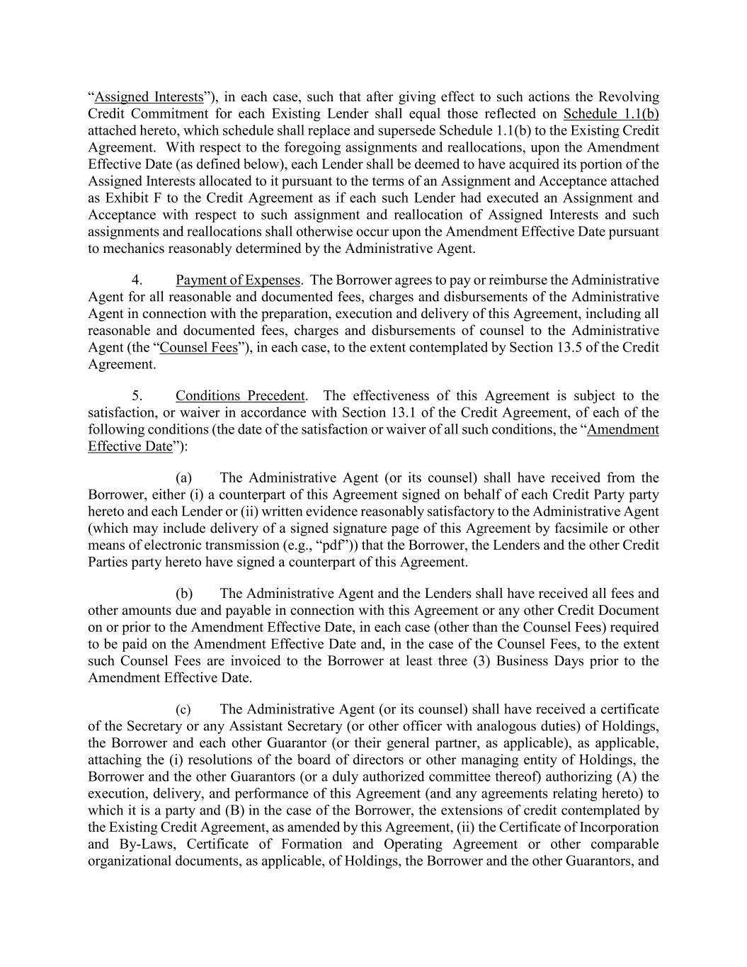 “Assigned Interests”), in each case, such that after giving effect to such actions the Revolving Credit Commitment for each Existing Lender shall equal those reflected on Schedule 1.1(b) attached hereto, which schedule shall replace and supersede Schedule 1.1(b) to the Existing Credit Agreement. With respect to the foregoing assignments and reallocations, upon the Amendment Effective Date (as defined below), each Lender shall be deemed to have acquired its portion of the Assigned Interests allocated to it pursuant to the terms of an Assignment and Acceptance attached as Exhibit F to the Credit Agreement as if each such Lender had executed an Assignment and Acceptance with respect to such assignment and reallocation of Assigned Interests and such assignments and reallocations shall otherwise occur upon the Amendment Effective Date pursuant to mechanics reasonably determined by the Administrative Agent. 4. Payment of Expenses. The Borrower agrees to pay or reimburse the Administrative Agent for all reasonable and documented fees, charges and disbursements of the Administrative Agent in connection with the preparation, execution and delivery of this Agreement, including all reasonable and documented fees, charges and disbursements of counsel to the Administrative Agent (the “Counsel Fees”), in each case, to the extent contemplated by Section 13.5 of the Credit Agreement. 5. Conditions Precedent. The effectiveness of this Agreement is subject to the satisfaction, or waiver in accordance with Section 13.1 of the Credit Agreement, of each of the following conditions (the date of the satisfaction or waiver of all such conditions, the “Amendment Effective Date”): (a) The Administrative Agent (or its counsel) shall have received from the Borrower, either (i) a counterpart of this Agreement signed on behalf of each Credit Party party hereto and each Lender or (ii) written evidence reasonably satisfactory to the Administrative Agent (which may include delivery of a signed signature page of this Agreement by facsimile or other means of electronic transmission (e.g., “pdf”)) that the Borrower, the Lenders and the other Credit Parties party hereto have signed a counterpart of this Agreement. (b) The Administrative Agent and the Lenders shall have received all fees and other amounts due and payable in connection with this Agreement or any other Credit Document on or prior to the Amendment Effective Date, in each case (other than the Counsel Fees) required to be paid on the Amendment Effective Date and, in the case of the Counsel Fees, to the extent such Counsel Fees are invoiced to the Borrower at least three (3) Business Days prior to the Amendment Effective Date. (c) The Administrative Agent (or its counsel) shall have received a certificate of the Secretary or any Assistant Secretary (or other officer with analogous duties) of Holdings, the Borrower and each other Guarantor (or their general partner, as applicable), as applicable, attaching the (i) resolutions of the board of directors or other managing entity of Holdings, the Borrower and the other Guarantors (or a duly authorized committee thereof) authorizing (A) the execution, delivery, and performance of this Agreement (and any agreements relating hereto) to which it is a party and (B) in the case of the Borrower, the extensions of credit contemplated by the Existing Credit Agreement, as amended by this Agreement, (ii) the Certificate of Incorporation and By-Laws, Certificate of Formation and Operating Agreement or other comparable organizational documents, as applicable, of Holdings, the Borrower and the other Guarantors, and