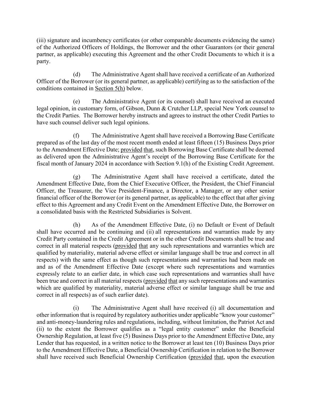 (iii) signature and incumbency certificates (or other comparable documents evidencing the same) of the Authorized Officers of Holdings, the Borrower and the other Guarantors (or their general partner, as applicable) executing this Agreement and the other Credit Documents to which it is a party. (d) The Administrative Agent shall have received a certificate of an Authorized Officer of the Borrower (or its general partner, as applicable) certifying as to the satisfaction of the conditions contained in Section 5(h) below. (e) The Administrative Agent (or its counsel) shall have received an executed legal opinion, in customary form, of Gibson, Dunn & Crutcher LLP, special New York counsel to the Credit Parties. The Borrower hereby instructs and agrees to instruct the other Credit Parties to have such counsel deliver such legal opinions. (f) The Administrative Agent shall have received a Borrowing Base Certificate prepared as of the last day of the most recent month ended at least fifteen (15) Business Days prior to the Amendment Effective Date; provided that, such Borrowing Base Certificate shall be deemed as delivered upon the Administrative Agent’s receipt of the Borrowing Base Certificate for the fiscal month of January 2024 in accordance with Section 9.1(h) of the Existing Credit Agreement. (g) The Administrative Agent shall have received a certificate, dated the Amendment Effective Date, from the Chief Executive Officer, the President, the Chief Financial Officer, the Treasurer, the Vice President-Finance, a Director, a Manager, or any other senior financial officer of the Borrower (or its general partner, as applicable) to the effect that after giving effect to this Agreement and any Credit Event on the Amendment Effective Date, the Borrower on a consolidated basis with the Restricted Subsidiaries is Solvent. (h) As of the Amendment Effective Date, (i) no Default or Event of Default shall have occurred and be continuing and (ii) all representations and warranties made by any Credit Party contained in the Credit Agreement or in the other Credit Documents shall be true and correct in all material respects (provided that any such representations and warranties which are qualified by materiality, material adverse effect or similar language shall be true and correct in all respects) with the same effect as though such representations and warranties had been made on and as of the Amendment Effective Date (except where such representations and warranties expressly relate to an earlier date, in which case such representations and warranties shall have been true and correct in all material respects (provided that any such representations and warranties which are qualified by materiality, material adverse effect or similar language shall be true and correct in all respects) as of such earlier date). (i) The Administrative Agent shall have received (i) all documentation and other information that is required by regulatory authorities under applicable “know your customer” and anti-money-laundering rules and regulations, including, without limitation, the Patriot Act and (ii) to the extent the Borrower qualifies as a “legal entity customer” under the Beneficial Ownership Regulation, at least five (5) Business Days prior to the Amendment Effective Date, any Lender that has requested, in a written notice to the Borrower at least ten (10) Business Days prior to the Amendment Effective Date, a Beneficial Ownership Certification in relation to the Borrower shall have received such Beneficial Ownership Certification (provided that, upon the execution