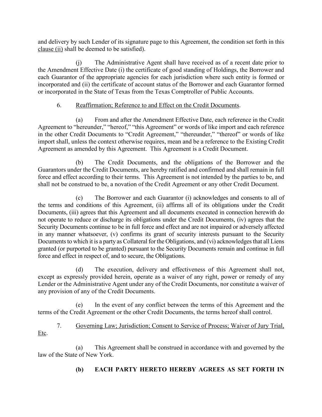 and delivery by such Lender of its signature page to this Agreement, the condition set forth in this clause (ii) shall be deemed to be satisfied). (j) The Administrative Agent shall have received as of a recent date prior to the Amendment Effective Date (i) the certificate of good standing of Holdings, the Borrower and each Guarantor of the appropriate agencies for each jurisdiction where such entity is formed or incorporated and (ii) the certificate of account status of the Borrower and each Guarantor formed or incorporated in the State of Texas from the Texas Comptroller of Public Accounts. 6. Reaffirmation; Reference to and Effect on the Credit Documents. (a) From and after the Amendment Effective Date, each reference in the Credit Agreement to “hereunder,” “hereof,” “this Agreement” or words of like import and each reference in the other Credit Documents to “Credit Agreement,” “thereunder,” “thereof” or words of like import shall, unless the context otherwise requires, mean and be a reference to the Existing Credit Agreement as amended by this Agreement. This Agreement is a Credit Document. (b) The Credit Documents, and the obligations of the Borrower and the Guarantors under the Credit Documents, are hereby ratified and confirmed and shall remain in full force and effect according to their terms. This Agreement is not intended by the parties to be, and shall not be construed to be, a novation of the Credit Agreement or any other Credit Document. (c) The Borrower and each Guarantor (i) acknowledges and consents to all of the terms and conditions of this Agreement, (ii) affirms all of its obligations under the Credit Documents, (iii) agrees that this Agreement and all documents executed in connection herewith do not operate to reduce or discharge its obligations under the Credit Documents, (iv) agrees that the Security Documents continue to be in full force and effect and are not impaired or adversely affected in any manner whatsoever, (v) confirms its grant of security interests pursuant to the Security Documents to which it is a party as Collateral for the Obligations, and (vi) acknowledges that all Liens granted (or purported to be granted) pursuant to the Security Documents remain and continue in full force and effect in respect of, and to secure, the Obligations. (d) The execution, delivery and effectiveness of this Agreement shall not, except as expressly provided herein, operate as a waiver of any right, power or remedy of any Lender or the Administrative Agent under any of the Credit Documents, nor constitute a waiver of any provision of any of the Credit Documents. (e) In the event of any conflict between the terms of this Agreement and the terms of the Credit Agreement or the other Credit Documents, the terms hereof shall control. 7. Governing Law; Jurisdiction; Consent to Service of Process; Waiver of Jury Trial, Etc. (a) This Agreement shall be construed in accordance with and governed by the law of the State of New York. (b) EACH PARTY HERETO HEREBY AGREES AS SET FORTH IN
