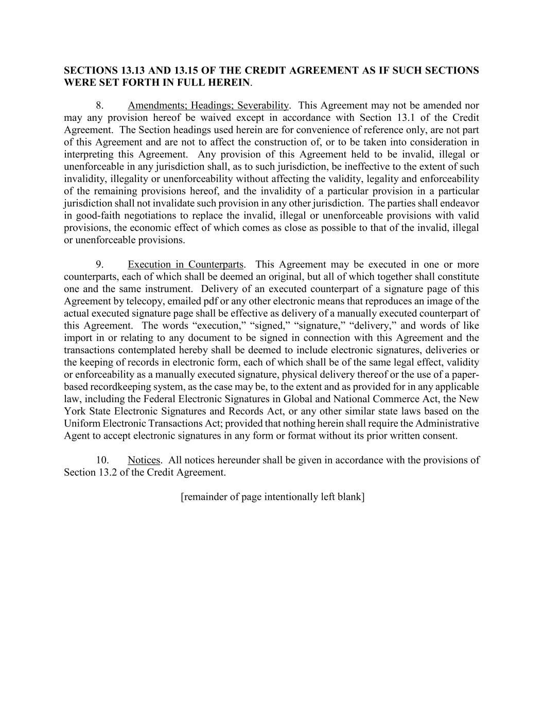 SECTIONS 13.13 AND 13.15 OF THE CREDIT AGREEMENT AS IF SUCH SECTIONS WERE SET FORTH IN FULL HEREIN. 8. Amendments; Headings; Severability. This Agreement may not be amended nor may any provision hereof be waived except in accordance with Section 13.1 of the Credit Agreement. The Section headings used herein are for convenience of reference only, are not part of this Agreement and are not to affect the construction of, or to be taken into consideration in interpreting this Agreement. Any provision of this Agreement held to be invalid, illegal or unenforceable in any jurisdiction shall, as to such jurisdiction, be ineffective to the extent of such invalidity, illegality or unenforceability without affecting the validity, legality and enforceability of the remaining provisions hereof, and the invalidity of a particular provision in a particular jurisdiction shall not invalidate such provision in any other jurisdiction. The parties shall endeavor in good-faith negotiations to replace the invalid, illegal or unenforceable provisions with valid provisions, the economic effect of which comes as close as possible to that of the invalid, illegal or unenforceable provisions. 9. Execution in Counterparts. This Agreement may be executed in one or more counterparts, each of which shall be deemed an original, but all of which together shall constitute one and the same instrument. Delivery of an executed counterpart of a signature page of this Agreement by telecopy, emailed pdf or any other electronic means that reproduces an image of the actual executed signature page shall be effective as delivery of a manually executed counterpart of this Agreement. The words “execution,” “signed,” “signature,” “delivery,” and words of like import in or relating to any document to be signed in connection with this Agreement and the transactions contemplated hereby shall be deemed to include electronic signatures, deliveries or the keeping of records in electronic form, each of which shall be of the same legal effect, validity or enforceability as a manually executed signature, physical delivery thereof or the use of a paper- based recordkeeping system, as the case may be, to the extent and as provided for in any applicable law, including the Federal Electronic Signatures in Global and National Commerce Act, the New York State Electronic Signatures and Records Act, or any other similar state laws based on the Uniform Electronic Transactions Act; provided that nothing herein shall require the Administrative Agent to accept electronic signatures in any form or format without its prior written consent. 10. Notices. All notices hereunder shall be given in accordance with the provisions of Section 13.2 of the Credit Agreement. [remainder of page intentionally left blank]