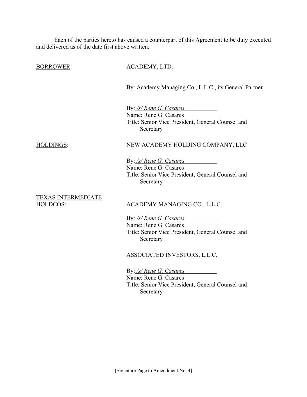 [Signature Page to Amendment No. 4] Each of the parties hereto has caused a counterpart of this Agreement to be duly executed and delivered as of the date first above written. BORROWER: ACADEMY, LTD. By: Academy Managing Co., L.L.C., its General Partner By: /s/ Rene G. Casares Name: Rene G. Casares Title: Senior Vice President, General Counsel and Secretary HOLDINGS: NEW ACADEMY HOLDING COMPANY, LLC By: /s/ Rene G. Casares Name: Rene G. Casares Title: Senior Vice President, General Counsel and Secretary TEXAS INTERMEDIATE HOLDCOS: ACADEMY MANAGING CO., L.L.C. By: /s/ Rene G. Casares Name: Rene G. Casares Title: Senior Vice President, General Counsel and Secretary ASSOCIATED INVESTORS, L.L.C. By: /s/ Rene G. Casares Name: Rene G. Casares Title: Senior Vice President, General Counsel and Secretary