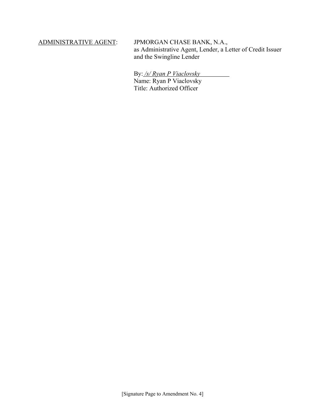 [Signature Page to Amendment No. 4] ADMINISTRATIVE AGENT: JPMORGAN CHASE BANK, N.A., as Administrative Agent, Lender, a Letter of Credit Issuer and the Swingline Lender By: /s/ Ryan P Viaclovsky Name: Ryan P Viaclovsky Title: Authorized Officer