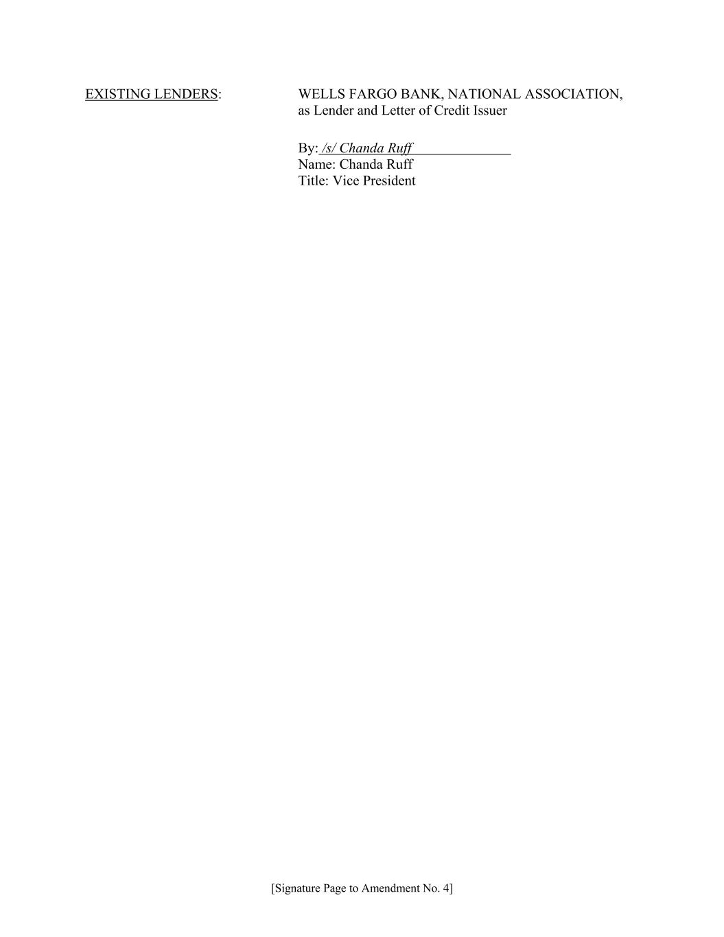 [Signature Page to Amendment No. 4] EXISTING LENDERS: WELLS FARGO BANK, NATIONAL ASSOCIATION, as Lender and Letter of Credit Issuer By: /s/ Chanda Ruff Name: Chanda Ruff Title: Vice President