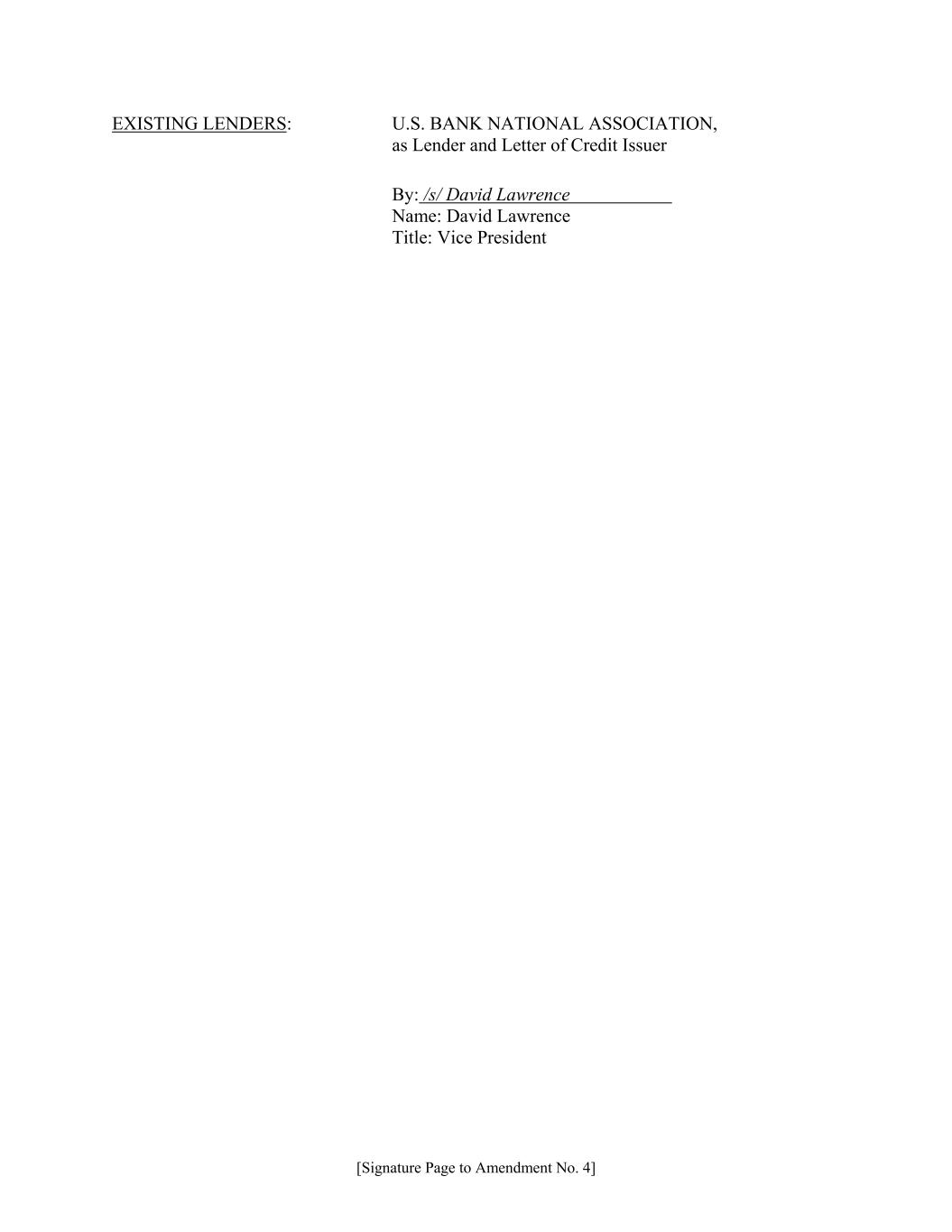 [Signature Page to Amendment No. 4] EXISTING LENDERS: U.S. BANK NATIONAL ASSOCIATION, as Lender and Letter of Credit Issuer By: /s/ David Lawrence Name: David Lawrence Title: Vice President