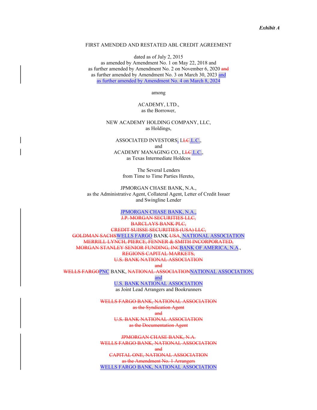 Exhibit A FIRST AMENDED AND RESTATED ABL CREDIT AGREEMENT dated as of July 2, 2015 as amended by Amendment No. 1 on May 22, 2018 and as further amended by Amendment No. 2 on November 6, 2020 and as further amended by Amendment No. 3 on March 30, 2023 and as further amended by Amendment No. 4 on March 8, 2024 among ACADEMY, LTD., as the Borrower, NEW ACADEMY HOLDING COMPANY, LLC, as Holdings, ASSOCIATED INVESTORS, LLC.L.C., and ACADEMY MANAGING CO., LLC.L.C., as Texas Intermediate Holdcos The Several Lenders from Time to Time Parties Hereto, JPMORGAN CHASE BANK, N.A., as the Administrative Agent, Collateral Agent, Letter of Credit Issuer and Swingline Lender JPMORGAN CHASE BANK, N.A., J.P. MORGAN SECURITIES LLC, BARCLAYS BANK PLC, CREDIT SUISSE SECURITIES (USA) LLC, GOLDMAN SACHSWELLS FARGO BANK USA, NATIONAL ASSOCIATION MERRILL LYNCH, PIERCE, FENNER & SMITH INCORPORATED, MORGAN STANLEY SENIOR FUNDING, INCBANK OF AMERICA, N.A., REGIONS CAPITAL MARKETS, U.S. BANK NATIONAL ASSOCIATION and WELLS FARGOPNC BANK, NATIONAL ASSOCIATIONNATIONAL ASSOCIATION, and U.S. BANK NATIONAL ASSOCIATION as Joint Lead Arrangers and Bookrunners WELLS FARGO BANK, NATIONAL ASSOCIATION as the Syndication Agent and U.S. BANK NATIONAL ASSOCIATION as the Documentation Agent JPMORGAN CHASE BANK, N.A. WELLS FARGO BANK, NATIONAL ASSOCIATION and CAPITAL ONE, NATIONAL ASSOCIATION as the Amendment No. 1 Arrangers WELLS FARGO BANK, NATIONAL ASSOCIATION