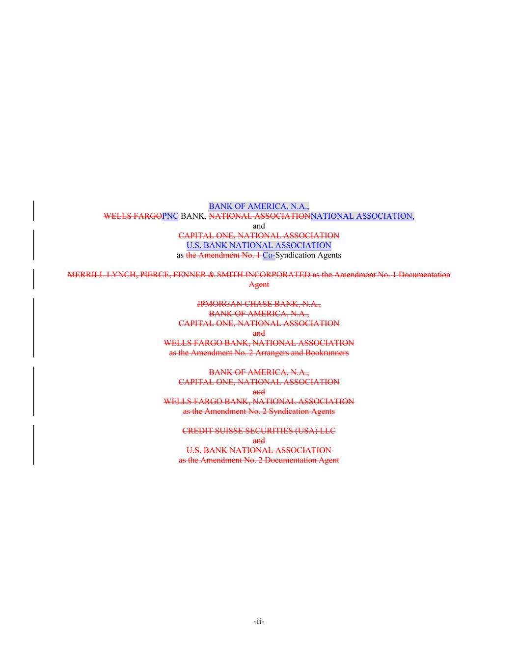 BANK OF AMERICA, N.A., WELLS FARGOPNC BANK, NATIONAL ASSOCIATIONNATIONAL ASSOCIATION, and CAPITAL ONE, NATIONAL ASSOCIATION U.S. BANK NATIONAL ASSOCIATION as the Amendment No. 1 Co-Syndication Agents MERRILL LYNCH, PIERCE, FENNER & SMITH INCORPORATED as the Amendment No. 1 Documentation Agent JPMORGAN CHASE BANK, N.A., BANK OF AMERICA, N.A., CAPITAL ONE, NATIONAL ASSOCIATION and WELLS FARGO BANK, NATIONAL ASSOCIATION as the Amendment No. 2 Arrangers and Bookrunners BANK OF AMERICA, N.A., CAPITAL ONE, NATIONAL ASSOCIATION and WELLS FARGO BANK, NATIONAL ASSOCIATION as the Amendment No. 2 Syndication Agents CREDIT SUISSE SECURITIES (USA) LLC and U.S. BANK NATIONAL ASSOCIATION as the Amendment No. 2 Documentation Agent -ii-