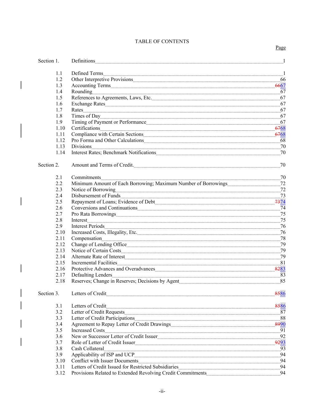 TABLE OF CONTENTS Page Section 1. Definitions 1 1.1 Defined Terms 1 1.2 Other Interpretive Provisions 66 1.3 Accounting Terms 6667 1.4 Rounding 67 1.5 References to Agreements, Laws, Etc. 67 1.6 Exchange Rates 67 1.7 Rates 67 1.8 Times of Day 67 1.9 Timing of Payment or Performance 67 1.10 Certifications 6768 1.11 Compliance with Certain Sections 6768 1.12 Pro Forma and Other Calculations 68 1.13 Divisions 70 1.14 Interest Rates; Benchmark Notifications 70 Section 2. Amount and Terms of Credit. 70 2.1 Commitments 70 2.2 Minimum Amount of Each Borrowing; Maximum Number of Borrowings 72 2.3 Notice of Borrowing 72 2.4 Disbursement of Funds 73 2.5 Repayment of Loans; Evidence of Debt 7374 2.6 Conversions and Continuations 74 2.7 Pro Rata Borrowings 75 2.8 Interest 75 2.9 Interest Periods 76 2.10 Increased Costs, Illegality, Etc. 76 2.11 Compensation 78 2.12 Change of Lending Office 79 2.13 Notice of Certain Costs 79 2.14 Alternate Rate of Interest 79 2.15 Incremental Facilities 81 2.16 Protective Advances and Overadvances 8283 2.17 Defaulting Lenders 83 2.18 Reserves; Change in Reserves; Decisions by Agent 85 Section 3. Letters of Credit 8586 3.1 Letters of Credit 8586 3.2 Letter of Credit Requests 87 3.3 Letter of Credit Participations 88 3.4 Agreement to Repay Letter of Credit Drawings 8990 3.5 Increased Costs 91 3.6 New or Successor Letter of Credit Issuer 92 3.7 Role of Letter of Credit Issuer 9293 3.8 Cash Collateral 93 3.9 Applicability of ISP and UCP 94 3.10 Conflict with Issuer Documents 94 3.11 Letters of Credit Issued for Restricted Subsidiaries 94 3.12 Provisions Related to Extended Revolving Credit Commitments 94 -ii-