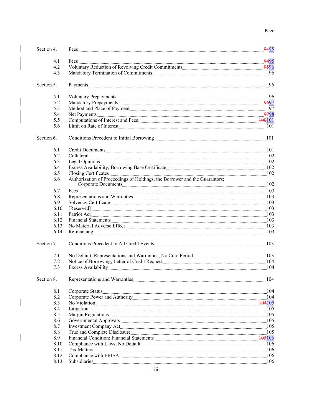 Page Section 4. Fees 9495 4.1 Fees 9495 4.2 Voluntary Reduction of Revolving Credit Commitments 9596 4.3 Mandatory Termination of Commitments 96 Section 5. Payments 96 5.1 Voluntary Prepayments 96 5.2 Mandatory Prepayments 9697 5.3 Method and Place of Payment 97 5.4 Net Payments 9798 5.5 Computations of Interest and Fees 100101 5.6 Limit on Rate of Interest 101 Section 6. Conditions Precedent to Initial Borrowing 101 6.1 Credit Documents 101 6.2 Collateral 102 6.3 Legal Opinions 102 6.4 Excess Availability; Borrowing Base Certificate 102 6.5 Closing Certificates 102 6.6 Authorization of Proceedings of Holdings, the Borrower and the Guarantors; Corporate Documents 102 6.7 Fees 103 6.8 Representations and Warranties 103 6.9 Solvency Certificate 103 6.10 [Reserved] 103 6.11 Patriot Act 103 6.12 Financial Statements 103 6.13 No Material Adverse Effect 103 6.14 Refinancing 103 Section 7. Conditions Precedent to All Credit Events 103 7.1 No Default; Representations and Warranties; No Cure Period 103 7.2 Notice of Borrowing; Letter of Credit Request 104 7.3 Excess Availability 104 Section 8. Representations and Warranties 104 8.1 Corporate Status 104 8.2 Corporate Power and Authority 104 8.3 No Violation 104105 8.4 Litigation 105 8.5 Margin Regulations 105 8.6 Governmental Approvals 105 8.7 Investment Company Act 105 8.8 True and Complete Disclosure 105 8.9 Financial Condition; Financial Statements 105106 8.10 Compliance with Laws; No Default 106 8.11 Tax Matters 106 8.12 Compliance with ERISA 106 8.13 Subsidiaries 106 -iii-