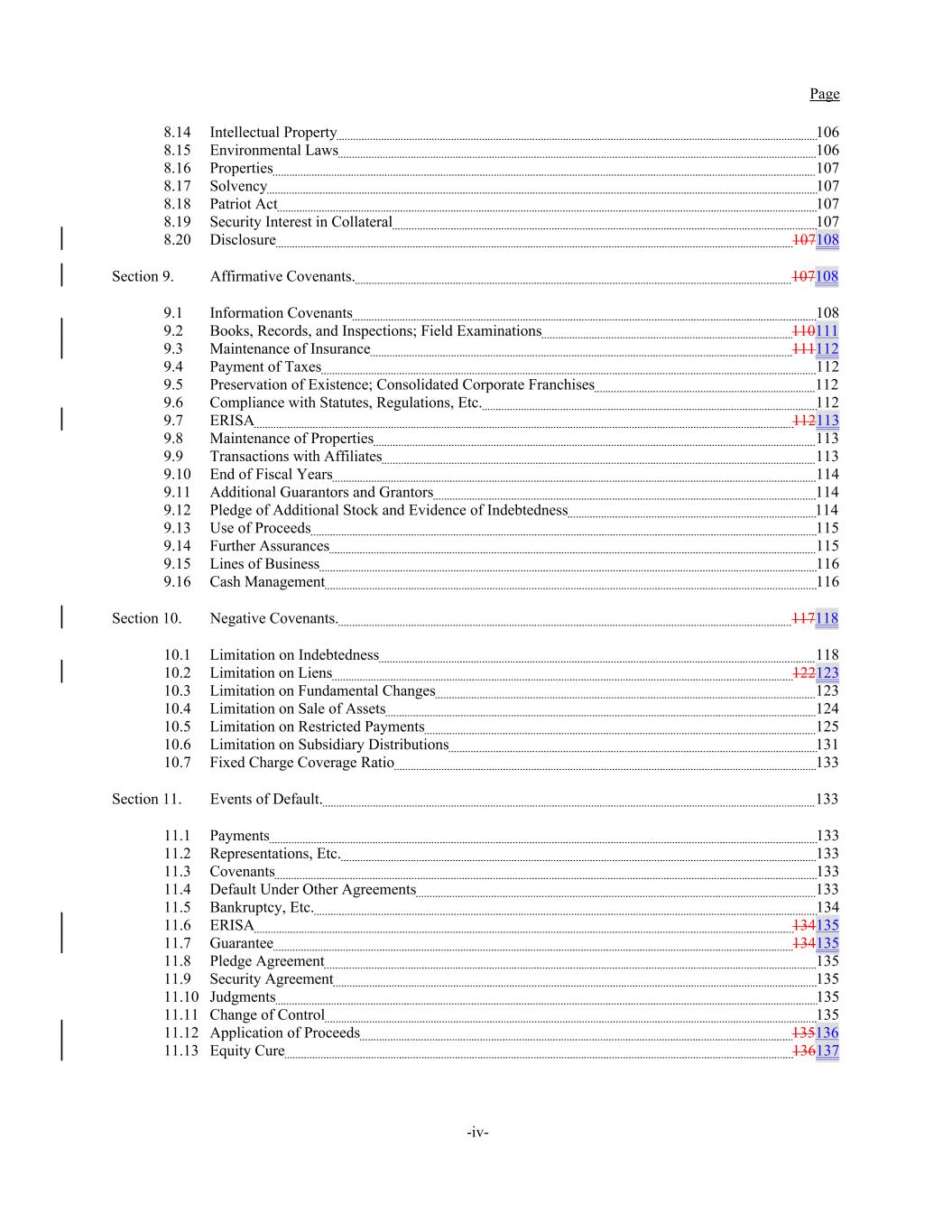 Page 8.14 Intellectual Property 106 8.15 Environmental Laws 106 8.16 Properties 107 8.17 Solvency 107 8.18 Patriot Act 107 8.19 Security Interest in Collateral 107 8.20 Disclosure 107108 Section 9. Affirmative Covenants. 107108 9.1 Information Covenants 108 9.2 Books, Records, and Inspections; Field Examinations 110111 9.3 Maintenance of Insurance 111112 9.4 Payment of Taxes 112 9.5 Preservation of Existence; Consolidated Corporate Franchises 112 9.6 Compliance with Statutes, Regulations, Etc. 112 9.7 ERISA 112113 9.8 Maintenance of Properties 113 9.9 Transactions with Affiliates 113 9.10 End of Fiscal Years 114 9.11 Additional Guarantors and Grantors 114 9.12 Pledge of Additional Stock and Evidence of Indebtedness 114 9.13 Use of Proceeds 115 9.14 Further Assurances 115 9.15 Lines of Business 116 9.16 Cash Management 116 Section 10. Negative Covenants. 117118 10.1 Limitation on Indebtedness 118 10.2 Limitation on Liens 122123 10.3 Limitation on Fundamental Changes 123 10.4 Limitation on Sale of Assets 124 10.5 Limitation on Restricted Payments 125 10.6 Limitation on Subsidiary Distributions 131 10.7 Fixed Charge Coverage Ratio 133 Section 11. Events of Default. 133 11.1 Payments 133 11.2 Representations, Etc. 133 11.3 Covenants 133 11.4 Default Under Other Agreements 133 11.5 Bankruptcy, Etc. 134 11.6 ERISA 134135 11.7 Guarantee 134135 11.8 Pledge Agreement 135 11.9 Security Agreement 135 11.10 Judgments 135 11.11 Change of Control 135 11.12 Application of Proceeds 135136 11.13 Equity Cure 136137 -iv-