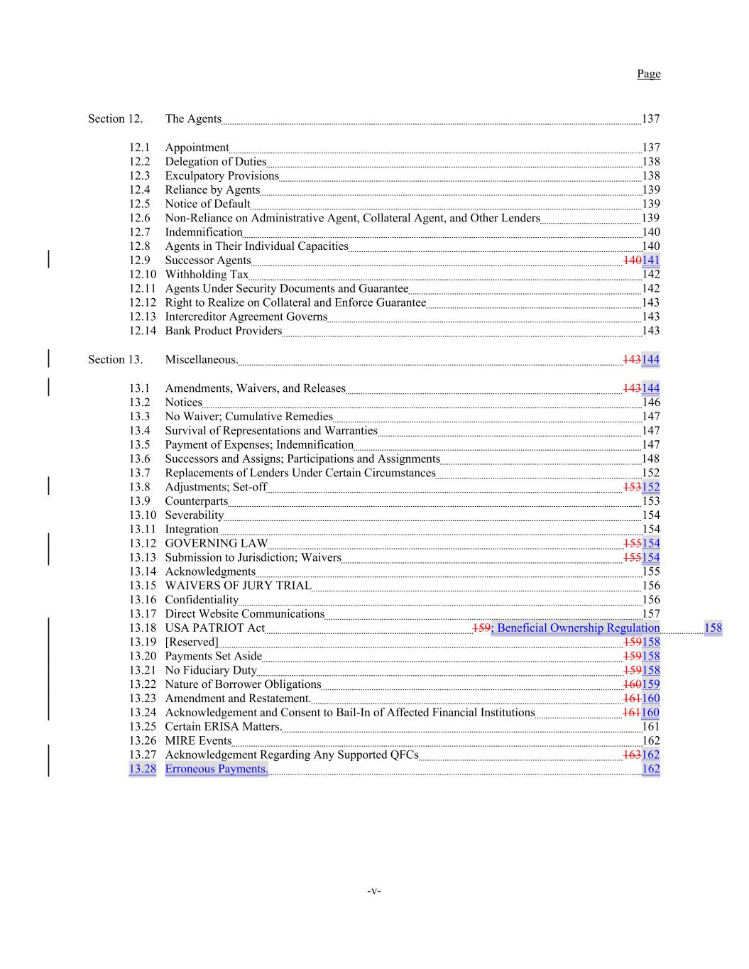 Page Section 12. The Agents 137 12.1 Appointment 137 12.2 Delegation of Duties 138 12.3 Exculpatory Provisions 138 12.4 Reliance by Agents 139 12.5 Notice of Default 139 12.6 Non-Reliance on Administrative Agent, Collateral Agent, and Other Lenders 139 12.7 Indemnification 140 12.8 Agents in Their Individual Capacities 140 12.9 Successor Agents 140141 12.10 Withholding Tax 142 12.11 Agents Under Security Documents and Guarantee 142 12.12 Right to Realize on Collateral and Enforce Guarantee 143 12.13 Intercreditor Agreement Governs 143 12.14 Bank Product Providers 143 Section 13. Miscellaneous. 143144 13.1 Amendments, Waivers, and Releases 143144 13.2 Notices 146 13.3 No Waiver; Cumulative Remedies 147 13.4 Survival of Representations and Warranties 147 13.5 Payment of Expenses; Indemnification 147 13.6 Successors and Assigns; Participations and Assignments 148 13.7 Replacements of Lenders Under Certain Circumstances 152 13.8 Adjustments; Set-off 153152 13.9 Counterparts 153 13.10 Severability 154 13.11 Integration 154 13.12 GOVERNING LAW 155154 13.13 Submission to Jurisdiction; Waivers 155154 13.14 Acknowledgments 155 13.15 WAIVERS OF JURY TRIAL 156 13.16 Confidentiality 156 13.17 Direct Website Communications 157 13.18 USA PATRIOT Act 159; Beneficial Ownership Regulation 158 13.19 [Reserved] 159158 13.20 Payments Set Aside 159158 13.21 No Fiduciary Duty 159158 13.22 Nature of Borrower Obligations 160159 13.23 Amendment and Restatement. 161160 13.24 Acknowledgement and Consent to Bail-In of Affected Financial Institutions 161160 13.25 Certain ERISA Matters. 161 13.26 MIRE Events 162 13.27 Acknowledgement Regarding Any Supported QFCs 163162 13.28 Erroneous Payments. 162 -v-