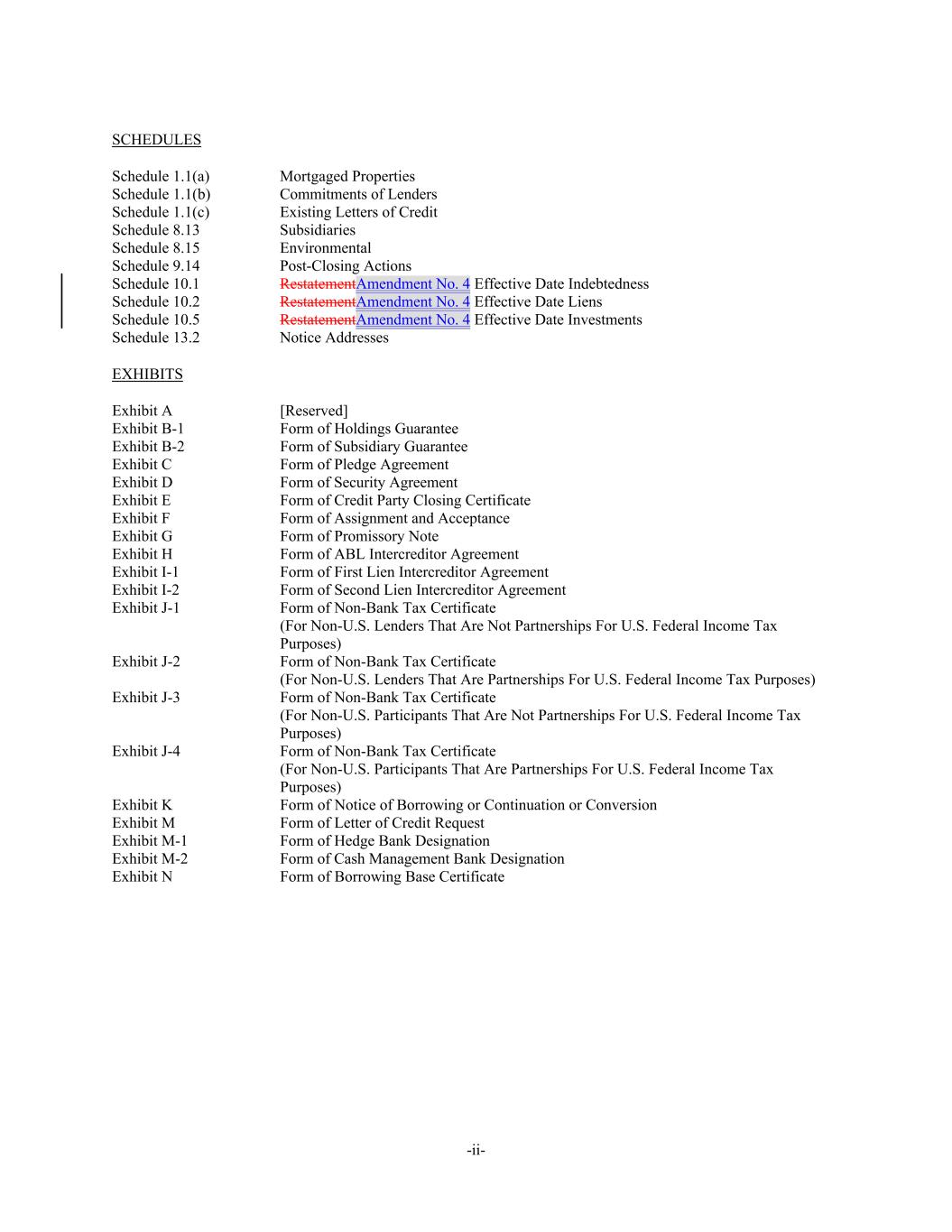 SCHEDULES Schedule 1.1(a) Mortgaged Properties Schedule 1.1(b) Commitments of Lenders Schedule 1.1(c) Existing Letters of Credit Schedule 8.13 Subsidiaries Schedule 8.15 Environmental Schedule 9.14 Post-Closing Actions Schedule 10.1 RestatementAmendment No. 4 Effective Date Indebtedness Schedule 10.2 RestatementAmendment No. 4 Effective Date Liens Schedule 10.5 RestatementAmendment No. 4 Effective Date Investments Schedule 13.2 Notice Addresses EXHIBITS Exhibit A [Reserved] Exhibit B-1 Form of Holdings Guarantee Exhibit B-2 Form of Subsidiary Guarantee Exhibit C Form of Pledge Agreement Exhibit D Form of Security Agreement Exhibit E Form of Credit Party Closing Certificate Exhibit F Form of Assignment and Acceptance Exhibit G Form of Promissory Note Exhibit H Form of ABL Intercreditor Agreement Exhibit I-1 Form of First Lien Intercreditor Agreement Exhibit I-2 Form of Second Lien Intercreditor Agreement Exhibit J-1 Form of Non-Bank Tax Certificate (For Non-U.S. Lenders That Are Not Partnerships For U.S. Federal Income Tax Purposes) Exhibit J-2 Form of Non-Bank Tax Certificate (For Non-U.S. Lenders That Are Partnerships For U.S. Federal Income Tax Purposes) Exhibit J-3 Form of Non-Bank Tax Certificate (For Non-U.S. Participants That Are Not Partnerships For U.S. Federal Income Tax Purposes) Exhibit J-4 Form of Non-Bank Tax Certificate (For Non-U.S. Participants That Are Partnerships For U.S. Federal Income Tax Purposes) Exhibit K Form of Notice of Borrowing or Continuation or Conversion Exhibit M Form of Letter of Credit Request Exhibit M-1 Form of Hedge Bank Designation Exhibit M-2 Form of Cash Management Bank Designation Exhibit N Form of Borrowing Base Certificate -ii-