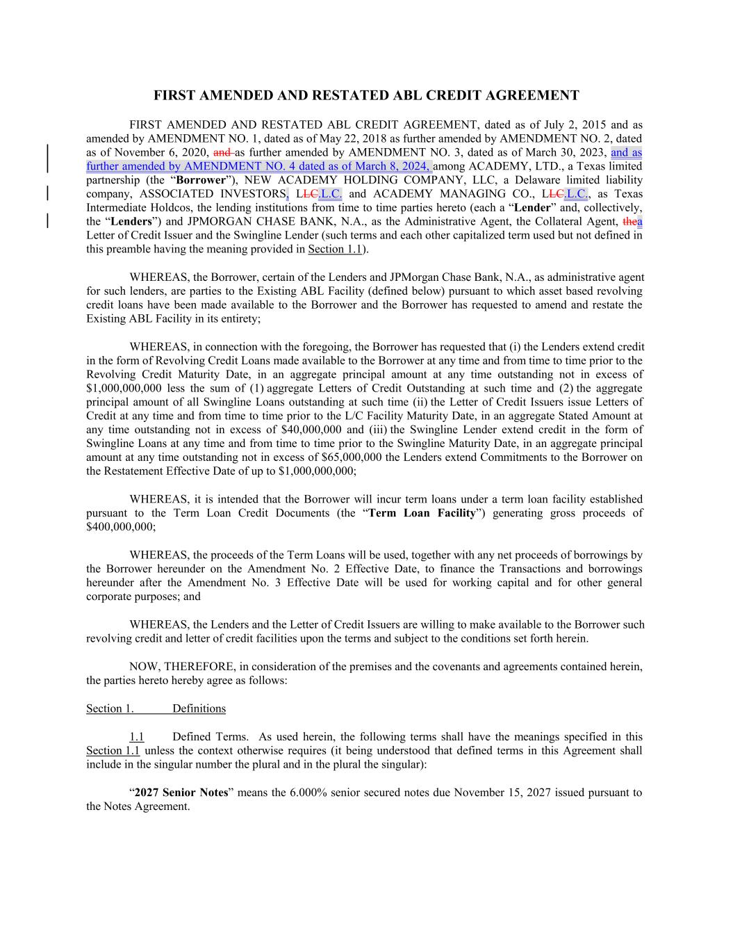 FIRST AMENDED AND RESTATED ABL CREDIT AGREEMENT FIRST AMENDED AND RESTATED ABL CREDIT AGREEMENT, dated as of July 2, 2015 and as amended by AMENDMENT NO. 1, dated as of May 22, 2018 as further amended by AMENDMENT NO. 2, dated as of November 6, 2020, and as further amended by AMENDMENT NO. 3, dated as of March 30, 2023, and as further amended by AMENDMENT NO. 4 dated as of March 8, 2024, among ACADEMY, LTD., a Texas limited partnership (the “Borrower”), NEW ACADEMY HOLDING COMPANY, LLC, a Delaware limited liability company, ASSOCIATED INVESTORS, LLC.L.C. and ACADEMY MANAGING CO., LLC.L.C., as Texas Intermediate Holdcos, the lending institutions from time to time parties hereto (each a “Lender” and, collectively, the “Lenders”) and JPMORGAN CHASE BANK, N.A., as the Administrative Agent, the Collateral Agent, thea Letter of Credit Issuer and the Swingline Lender (such terms and each other capitalized term used but not defined in this preamble having the meaning provided in Section 1.1). WHEREAS, the Borrower, certain of the Lenders and JPMorgan Chase Bank, N.A., as administrative agent for such lenders, are parties to the Existing ABL Facility (defined below) pursuant to which asset based revolving credit loans have been made available to the Borrower and the Borrower has requested to amend and restate the Existing ABL Facility in its entirety; WHEREAS, in connection with the foregoing, the Borrower has requested that (i) the Lenders extend credit in the form of Revolving Credit Loans made available to the Borrower at any time and from time to time prior to the Revolving Credit Maturity Date, in an aggregate principal amount at any time outstanding not in excess of $1,000,000,000 less the sum of (1) aggregate Letters of Credit Outstanding at such time and (2) the aggregate principal amount of all Swingline Loans outstanding at such time (ii) the Letter of Credit Issuers issue Letters of Credit at any time and from time to time prior to the L/C Facility Maturity Date, in an aggregate Stated Amount at any time outstanding not in excess of $40,000,000 and (iii) the Swingline Lender extend credit in the form of Swingline Loans at any time and from time to time prior to the Swingline Maturity Date, in an aggregate principal amount at any time outstanding not in excess of $65,000,000 the Lenders extend Commitments to the Borrower on the Restatement Effective Date of up to $1,000,000,000; WHEREAS, it is intended that the Borrower will incur term loans under a term loan facility established pursuant to the Term Loan Credit Documents (the “Term Loan Facility”) generating gross proceeds of $400,000,000; WHEREAS, the proceeds of the Term Loans will be used, together with any net proceeds of borrowings by the Borrower hereunder on the Amendment No. 2 Effective Date, to finance the Transactions and borrowings hereunder after the Amendment No. 3 Effective Date will be used for working capital and for other general corporate purposes; and WHEREAS, the Lenders and the Letter of Credit Issuers are willing to make available to the Borrower such revolving credit and letter of credit facilities upon the terms and subject to the conditions set forth herein. NOW, THEREFORE, in consideration of the premises and the covenants and agreements contained herein, the parties hereto hereby agree as follows: Section 1. Definitions 1.1 Defined Terms. As used herein, the following terms shall have the meanings specified in this Section 1.1 unless the context otherwise requires (it being understood that defined terms in this Agreement shall include in the singular number the plural and in the plural the singular): “2027 Senior Notes” means the 6.000% senior secured notes due November 15, 2027 issued pursuant to the Notes Agreement.