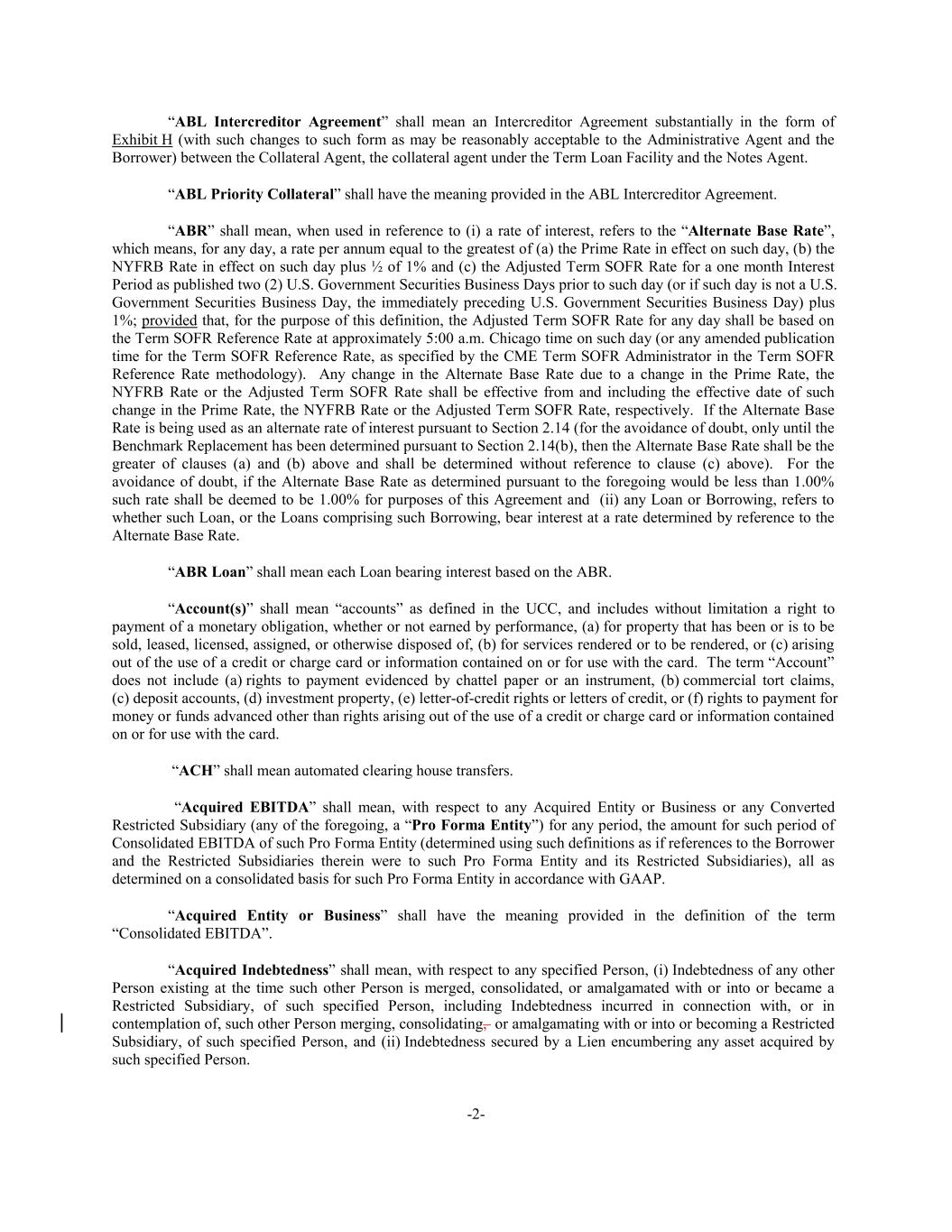 “ABL Intercreditor Agreement” shall mean an Intercreditor Agreement substantially in the form of Exhibit H (with such changes to such form as may be reasonably acceptable to the Administrative Agent and the Borrower) between the Collateral Agent, the collateral agent under the Term Loan Facility and the Notes Agent. “ABL Priority Collateral” shall have the meaning provided in the ABL Intercreditor Agreement. “ABR” shall mean, when used in reference to (i) a rate of interest, refers to the “Alternate Base Rate”, which means, for any day, a rate per annum equal to the greatest of (a) the Prime Rate in effect on such day, (b) the NYFRB Rate in effect on such day plus ½ of 1% and (c) the Adjusted Term SOFR Rate for a one month Interest Period as published two (2) U.S. Government Securities Business Days prior to such day (or if such day is not a U.S. Government Securities Business Day, the immediately preceding U.S. Government Securities Business Day) plus 1%; provided that, for the purpose of this definition, the Adjusted Term SOFR Rate for any day shall be based on the Term SOFR Reference Rate at approximately 5:00 a.m. Chicago time on such day (or any amended publication time for the Term SOFR Reference Rate, as specified by the CME Term SOFR Administrator in the Term SOFR Reference Rate methodology). Any change in the Alternate Base Rate due to a change in the Prime Rate, the NYFRB Rate or the Adjusted Term SOFR Rate shall be effective from and including the effective date of such change in the Prime Rate, the NYFRB Rate or the Adjusted Term SOFR Rate, respectively. If the Alternate Base Rate is being used as an alternate rate of interest pursuant to Section 2.14 (for the avoidance of doubt, only until the Benchmark Replacement has been determined pursuant to Section 2.14(b), then the Alternate Base Rate shall be the greater of clauses (a) and (b) above and shall be determined without reference to clause (c) above). For the avoidance of doubt, if the Alternate Base Rate as determined pursuant to the foregoing would be less than 1.00% such rate shall be deemed to be 1.00% for purposes of this Agreement and (ii) any Loan or Borrowing, refers to whether such Loan, or the Loans comprising such Borrowing, bear interest at a rate determined by reference to the Alternate Base Rate. “ABR Loan” shall mean each Loan bearing interest based on the ABR. “Account(s)” shall mean “accounts” as defined in the UCC, and includes without limitation a right to payment of a monetary obligation, whether or not earned by performance, (a) for property that has been or is to be sold, leased, licensed, assigned, or otherwise disposed of, (b) for services rendered or to be rendered, or (c) arising out of the use of a credit or charge card or information contained on or for use with the card. The term “Account” does not include (a) rights to payment evidenced by chattel paper or an instrument, (b) commercial tort claims, (c) deposit accounts, (d) investment property, (e) letter-of-credit rights or letters of credit, or (f) rights to payment for money or funds advanced other than rights arising out of the use of a credit or charge card or information contained on or for use with the card. “ACH” shall mean automated clearing house transfers. “Acquired EBITDA” shall mean, with respect to any Acquired Entity or Business or any Converted Restricted Subsidiary (any of the foregoing, a “Pro Forma Entity”) for any period, the amount for such period of Consolidated EBITDA of such Pro Forma Entity (determined using such definitions as if references to the Borrower and the Restricted Subsidiaries therein were to such Pro Forma Entity and its Restricted Subsidiaries), all as determined on a consolidated basis for such Pro Forma Entity in accordance with GAAP. “Acquired Entity or Business” shall have the meaning provided in the definition of the term “Consolidated EBITDA”. “Acquired Indebtedness” shall mean, with respect to any specified Person, (i) Indebtedness of any other Person existing at the time such other Person is merged, consolidated, or amalgamated with or into or became a Restricted Subsidiary, of such specified Person, including Indebtedness incurred in connection with, or in contemplation of, such other Person merging, consolidating, or amalgamating with or into or becoming a Restricted Subsidiary, of such specified Person, and (ii) Indebtedness secured by a Lien encumbering any asset acquired by such specified Person. -2-
