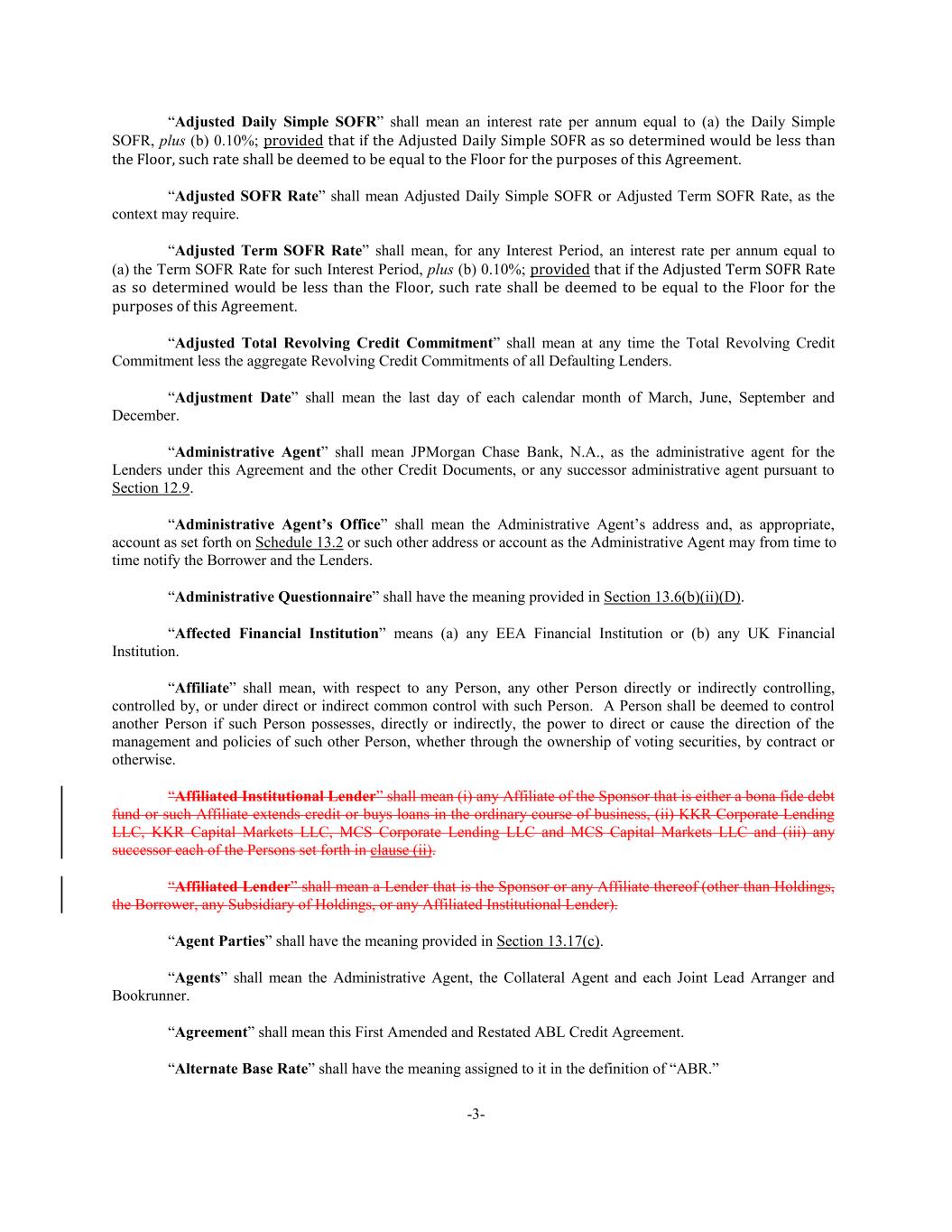 “Adjusted Daily Simple SOFR” shall mean an interest rate per annum equal to (a) the Daily Simple SOFR, plus (b) 0.10%; provided that if the Adjusted Daily Simple SOFR as so determined would be less than the Floor, such rate shall be deemed to be equal to the Floor for the purposes of this Agreement. “Adjusted SOFR Rate” shall mean Adjusted Daily Simple SOFR or Adjusted Term SOFR Rate, as the context may require. “Adjusted Term SOFR Rate” shall mean, for any Interest Period, an interest rate per annum equal to (a) the Term SOFR Rate for such Interest Period, plus (b) 0.10%; provided that if the Adjusted Term SOFR Rate as so determined would be less than the Floor, such rate shall be deemed to be equal to the Floor for the purposes of this Agreement. “Adjusted Total Revolving Credit Commitment” shall mean at any time the Total Revolving Credit Commitment less the aggregate Revolving Credit Commitments of all Defaulting Lenders. “Adjustment Date” shall mean the last day of each calendar month of March, June, September and December. “Administrative Agent” shall mean JPMorgan Chase Bank, N.A., as the administrative agent for the Lenders under this Agreement and the other Credit Documents, or any successor administrative agent pursuant to Section 12.9. “Administrative Agent’s Office” shall mean the Administrative Agent’s address and, as appropriate, account as set forth on Schedule 13.2 or such other address or account as the Administrative Agent may from time to time notify the Borrower and the Lenders. “Administrative Questionnaire” shall have the meaning provided in Section 13.6(b)(ii)(D). “Affected Financial Institution” means (a) any EEA Financial Institution or (b) any UK Financial Institution. “Affiliate” shall mean, with respect to any Person, any other Person directly or indirectly controlling, controlled by, or under direct or indirect common control with such Person. A Person shall be deemed to control another Person if such Person possesses, directly or indirectly, the power to direct or cause the direction of the management and policies of such other Person, whether through the ownership of voting securities, by contract or otherwise. “Affiliated Institutional Lender” shall mean (i) any Affiliate of the Sponsor that is either a bona fide debt fund or such Affiliate extends credit or buys loans in the ordinary course of business, (ii) KKR Corporate Lending LLC, KKR Capital Markets LLC, MCS Corporate Lending LLC and MCS Capital Markets LLC and (iii) any successor each of the Persons set forth in clause (ii). “Affiliated Lender” shall mean a Lender that is the Sponsor or any Affiliate thereof (other than Holdings, the Borrower, any Subsidiary of Holdings, or any Affiliated Institutional Lender). “Agent Parties” shall have the meaning provided in Section 13.17(c). “Agents” shall mean the Administrative Agent, the Collateral Agent and each Joint Lead Arranger and Bookrunner. “Agreement” shall mean this First Amended and Restated ABL Credit Agreement. “Alternate Base Rate” shall have the meaning assigned to it in the definition of “ABR.” -3-