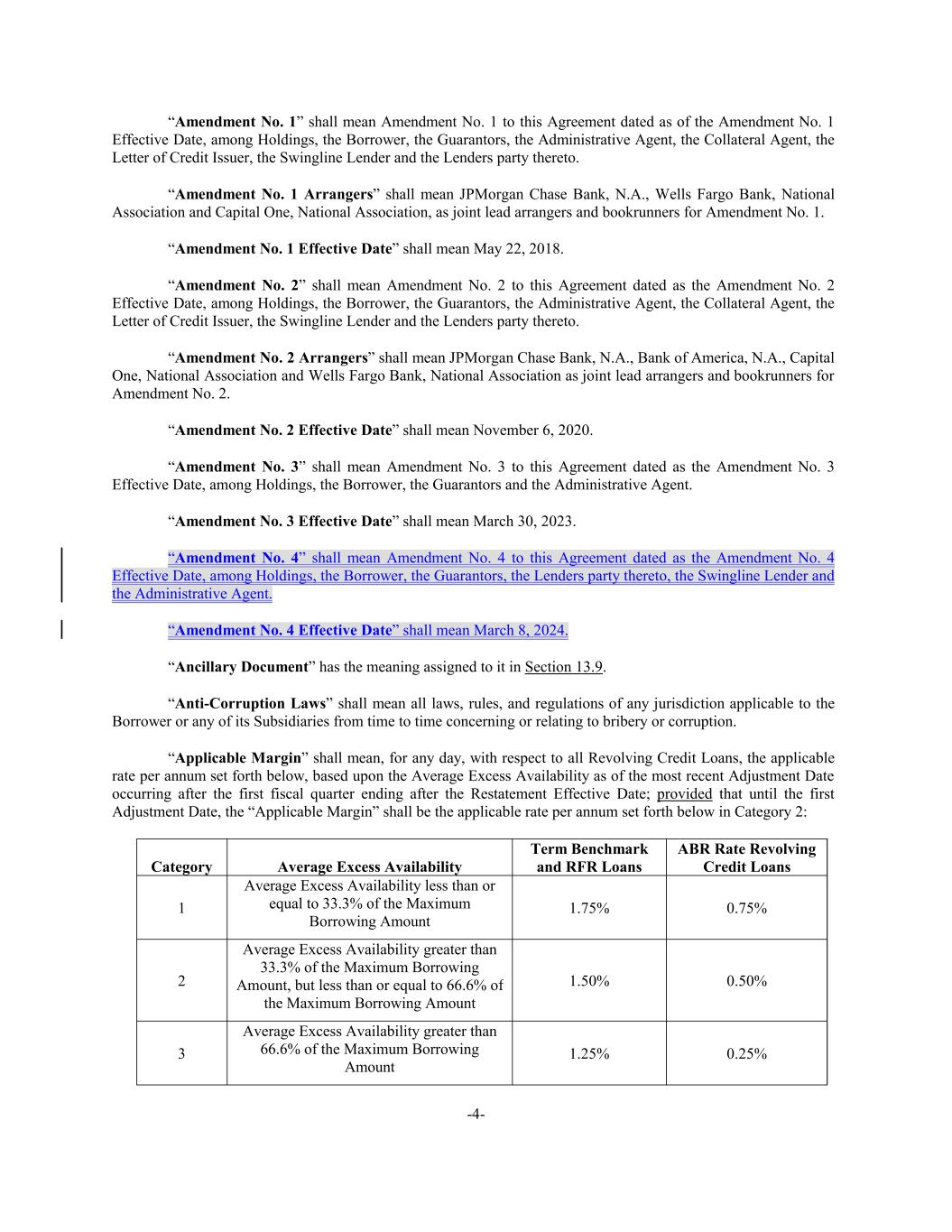 -4- 0.75% Term Benchmark and RFR Loans 2 ABR Rate Revolving Credit Loans Average Excess Availability greater than 33.3% of the Maximum Borrowing Amount, but less than or equal to 66.6% of the Maximum Borrowing Amount 1.50% 0.50% Category 1 3 Average Excess Availability greater than 66.6% of the Maximum Borrowing Amount Average Excess Availability less than or equal to 33.3% of the Maximum Borrowing Amount 1.25% Average Excess Availability 0.25% 1.75% “Amendment No. 1” shall mean Amendment No. 1 to this Agreement dated as of the Amendment No. 1 Effective Date, among Holdings, the Borrower, the Guarantors, the Administrative Agent, the Collateral Agent, the Letter of Credit Issuer, the Swingline Lender and the Lenders party thereto. “Amendment No. 1 Arrangers” shall mean JPMorgan Chase Bank, N.A., Wells Fargo Bank, National Association and Capital One, National Association, as joint lead arrangers and bookrunners for Amendment No. 1. “Amendment No. 1 Effective Date” shall mean May 22, 2018. “Amendment No. 2” shall mean Amendment No. 2 to this Agreement dated as the Amendment No. 2 Effective Date, among Holdings, the Borrower, the Guarantors, the Administrative Agent, the Collateral Agent, the Letter of Credit Issuer, the Swingline Lender and the Lenders party thereto. “Amendment No. 2 Arrangers” shall mean JPMorgan Chase Bank, N.A., Bank of America, N.A., Capital One, National Association and Wells Fargo Bank, National Association as joint lead arrangers and bookrunners for Amendment No. 2. “Amendment No. 2 Effective Date” shall mean November 6, 2020. “Amendment No. 3” shall mean Amendment No. 3 to this Agreement dated as the Amendment No. 3 Effective Date, among Holdings, the Borrower, the Guarantors and the Administrative Agent. “Amendment No. 3 Effective Date” shall mean March 30, 2023. “Amendment No. 4” shall mean Amendment No. 4 to this Agreement dated as the Amendment No. 4 Effective Date, among Holdings, the Borrower, the Guarantors, the Lenders party thereto, the Swingline Lender and the Administrative Agent. “Amendment No. 4 Effective Date” shall mean March 8, 2024. “Ancillary Document” has the meaning assigned to it in Section 13.9. “Anti-Corruption Laws” shall mean all laws, rules, and regulations of any jurisdiction applicable to the Borrower or any of its Subsidiaries from time to time concerning or relating to bribery or corruption. “Applicable Margin” shall mean, for any day, with respect to all Revolving Credit Loans, the applicable rate per annum set forth below, based upon the Average Excess Availability as of the most recent Adjustment Date occurring after the first fiscal quarter ending after the Restatement Effective Date; provided that until the first Adjustment Date, the “Applicable Margin” shall be the applicable rate per annum set forth below in Category 2: