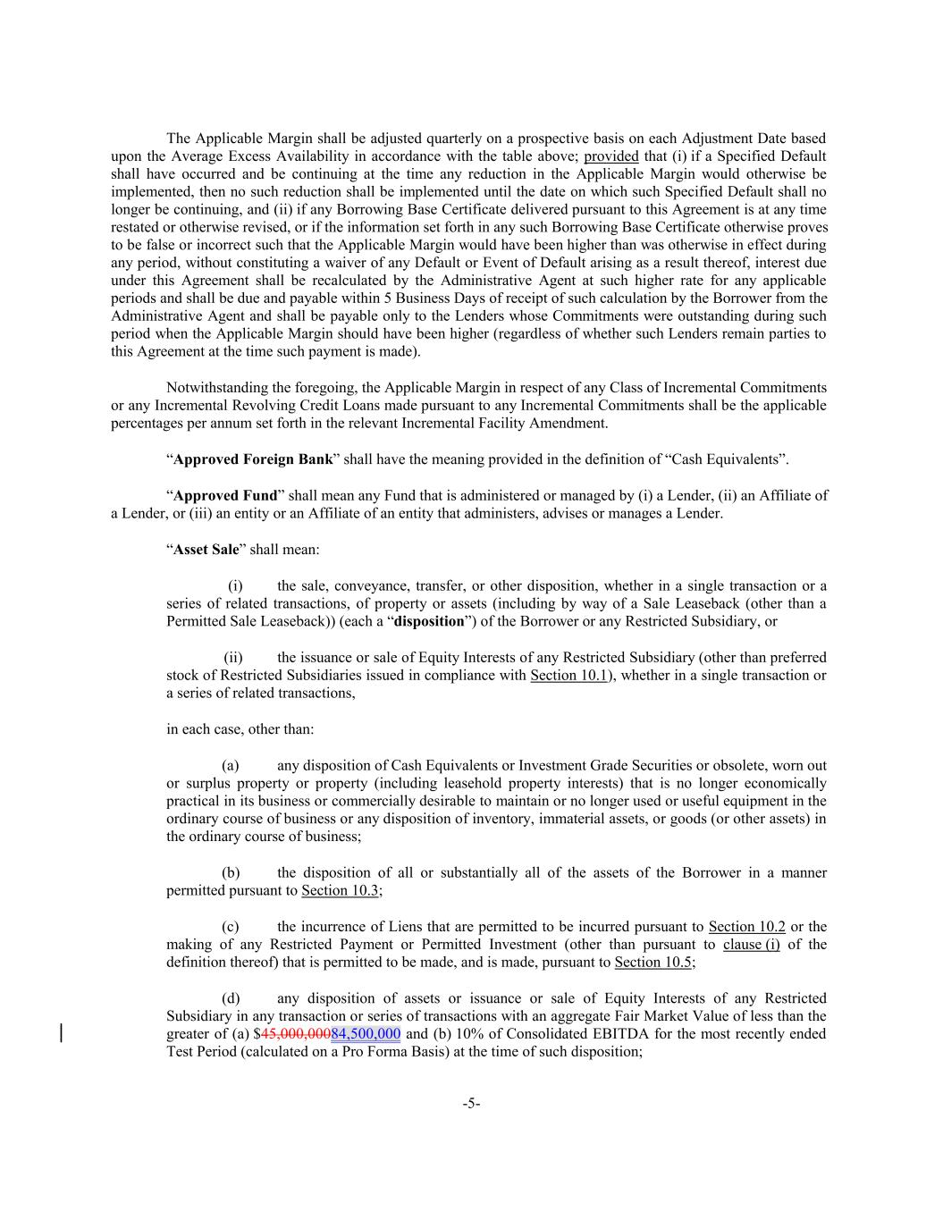 The Applicable Margin shall be adjusted quarterly on a prospective basis on each Adjustment Date based upon the Average Excess Availability in accordance with the table above; provided that (i) if a Specified Default shall have occurred and be continuing at the time any reduction in the Applicable Margin would otherwise be implemented, then no such reduction shall be implemented until the date on which such Specified Default shall no longer be continuing, and (ii) if any Borrowing Base Certificate delivered pursuant to this Agreement is at any time restated or otherwise revised, or if the information set forth in any such Borrowing Base Certificate otherwise proves to be false or incorrect such that the Applicable Margin would have been higher than was otherwise in effect during any period, without constituting a waiver of any Default or Event of Default arising as a result thereof, interest due under this Agreement shall be recalculated by the Administrative Agent at such higher rate for any applicable periods and shall be due and payable within 5 Business Days of receipt of such calculation by the Borrower from the Administrative Agent and shall be payable only to the Lenders whose Commitments were outstanding during such period when the Applicable Margin should have been higher (regardless of whether such Lenders remain parties to this Agreement at the time such payment is made). Notwithstanding the foregoing, the Applicable Margin in respect of any Class of Incremental Commitments or any Incremental Revolving Credit Loans made pursuant to any Incremental Commitments shall be the applicable percentages per annum set forth in the relevant Incremental Facility Amendment. “Approved Foreign Bank” shall have the meaning provided in the definition of “Cash Equivalents”. “Approved Fund” shall mean any Fund that is administered or managed by (i) a Lender, (ii) an Affiliate of a Lender, or (iii) an entity or an Affiliate of an entity that administers, advises or manages a Lender. “Asset Sale” shall mean: (i) the sale, conveyance, transfer, or other disposition, whether in a single transaction or a series of related transactions, of property or assets (including by way of a Sale Leaseback (other than a Permitted Sale Leaseback)) (each a “disposition”) of the Borrower or any Restricted Subsidiary, or (ii) the issuance or sale of Equity Interests of any Restricted Subsidiary (other than preferred stock of Restricted Subsidiaries issued in compliance with Section 10.1), whether in a single transaction or a series of related transactions, in each case, other than: (a) any disposition of Cash Equivalents or Investment Grade Securities or obsolete, worn out or surplus property or property (including leasehold property interests) that is no longer economically practical in its business or commercially desirable to maintain or no longer used or useful equipment in the ordinary course of business or any disposition of inventory, immaterial assets, or goods (or other assets) in the ordinary course of business; (b) the disposition of all or substantially all of the assets of the Borrower in a manner permitted pursuant to Section 10.3; (c) the incurrence of Liens that are permitted to be incurred pursuant to Section 10.2 or the making of any Restricted Payment or Permitted Investment (other than pursuant to clause (i) of the definition thereof) that is permitted to be made, and is made, pursuant to Section 10.5; (d) any disposition of assets or issuance or sale of Equity Interests of any Restricted Subsidiary in any transaction or series of transactions with an aggregate Fair Market Value of less than the greater of (a) $45,000,00084,500,000 and (b) 10% of Consolidated EBITDA for the most recently ended Test Period (calculated on a Pro Forma Basis) at the time of such disposition; -5-