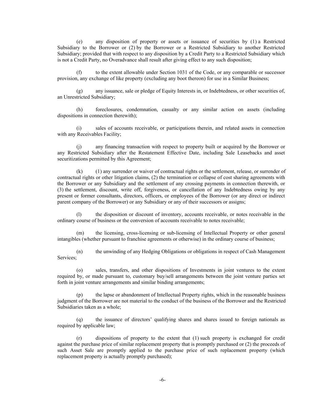 (e) any disposition of property or assets or issuance of securities by (1) a Restricted Subsidiary to the Borrower or (2) by the Borrower or a Restricted Subsidiary to another Restricted Subsidiary; provided that with respect to any disposition by a Credit Party to a Restricted Subsidiary which is not a Credit Party, no Overadvance shall result after giving effect to any such disposition; (f) to the extent allowable under Section 1031 of the Code, or any comparable or successor provision, any exchange of like property (excluding any boot thereon) for use in a Similar Business; (g) any issuance, sale or pledge of Equity Interests in, or Indebtedness, or other securities of, an Unrestricted Subsidiary; (h) foreclosures, condemnation, casualty or any similar action on assets (including dispositions in connection therewith); (i) sales of accounts receivable, or participations therein, and related assets in connection with any Receivables Facility; (j) any financing transaction with respect to property built or acquired by the Borrower or any Restricted Subsidiary after the Restatement Effective Date, including Sale Leasebacks and asset securitizations permitted by this Agreement; (k) (1) any surrender or waiver of contractual rights or the settlement, release, or surrender of contractual rights or other litigation claims, (2) the termination or collapse of cost sharing agreements with the Borrower or any Subsidiary and the settlement of any crossing payments in connection therewith, or (3) the settlement, discount, write off, forgiveness, or cancellation of any Indebtedness owing by any present or former consultants, directors, officers, or employees of the Borrower (or any direct or indirect parent company of the Borrower) or any Subsidiary or any of their successors or assigns; (l) the disposition or discount of inventory, accounts receivable, or notes receivable in the ordinary course of business or the conversion of accounts receivable to notes receivable; (m) the licensing, cross-licensing or sub-licensing of Intellectual Property or other general intangibles (whether pursuant to franchise agreements or otherwise) in the ordinary course of business; (n) the unwinding of any Hedging Obligations or obligations in respect of Cash Management Services; (o) sales, transfers, and other dispositions of Investments in joint ventures to the extent required by, or made pursuant to, customary buy/sell arrangements between the joint venture parties set forth in joint venture arrangements and similar binding arrangements; (p) the lapse or abandonment of Intellectual Property rights, which in the reasonable business judgment of the Borrower are not material to the conduct of the business of the Borrower and the Restricted Subsidiaries taken as a whole; (q) the issuance of directors’ qualifying shares and shares issued to foreign nationals as required by applicable law; (r) dispositions of property to the extent that (1) such property is exchanged for credit against the purchase price of similar replacement property that is promptly purchased or (2) the proceeds of such Asset Sale are promptly applied to the purchase price of such replacement property (which replacement property is actually promptly purchased); -6-