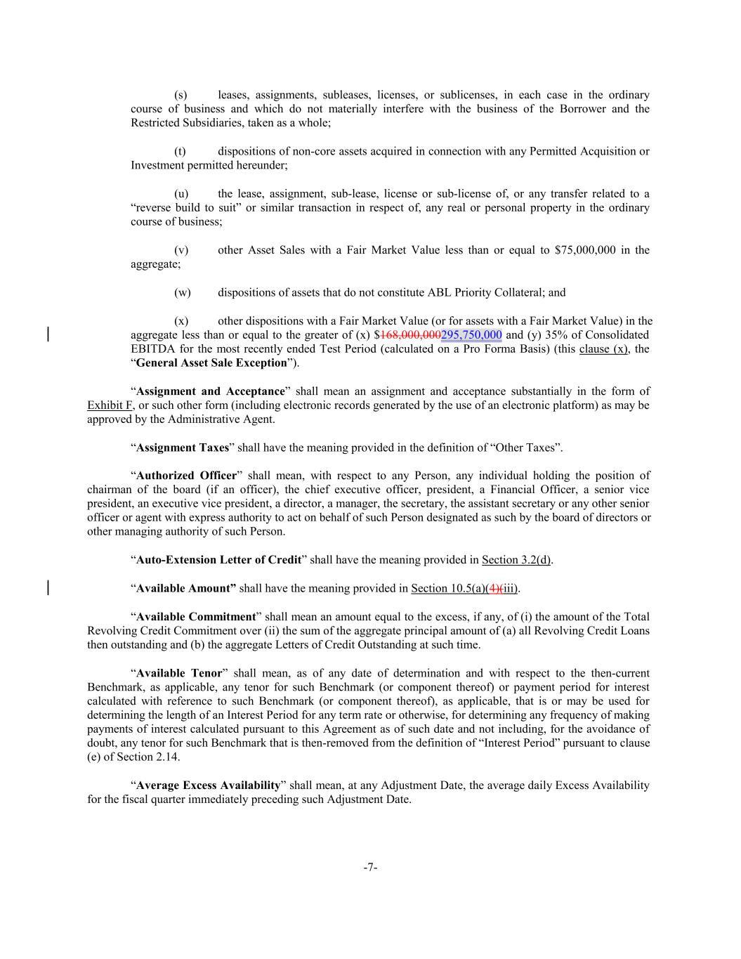 (s) leases, assignments, subleases, licenses, or sublicenses, in each case in the ordinary course of business and which do not materially interfere with the business of the Borrower and the Restricted Subsidiaries, taken as a whole; (t) dispositions of non-core assets acquired in connection with any Permitted Acquisition or Investment permitted hereunder; (u) the lease, assignment, sub-lease, license or sub-license of, or any transfer related to a “reverse build to suit” or similar transaction in respect of, any real or personal property in the ordinary course of business; (v) other Asset Sales with a Fair Market Value less than or equal to $75,000,000 in the aggregate; (w) dispositions of assets that do not constitute ABL Priority Collateral; and (x) other dispositions with a Fair Market Value (or for assets with a Fair Market Value) in the aggregate less than or equal to the greater of (x) $168,000,000295,750,000 and (y) 35% of Consolidated EBITDA for the most recently ended Test Period (calculated on a Pro Forma Basis) (this clause (x), the “General Asset Sale Exception”). “Assignment and Acceptance” shall mean an assignment and acceptance substantially in the form of Exhibit F, or such other form (including electronic records generated by the use of an electronic platform) as may be approved by the Administrative Agent. “Assignment Taxes” shall have the meaning provided in the definition of “Other Taxes”. “Authorized Officer” shall mean, with respect to any Person, any individual holding the position of chairman of the board (if an officer), the chief executive officer, president, a Financial Officer, a senior vice president, an executive vice president, a director, a manager, the secretary, the assistant secretary or any other senior officer or agent with express authority to act on behalf of such Person designated as such by the board of directors or other managing authority of such Person. “Auto-Extension Letter of Credit” shall have the meaning provided in Section 3.2(d). “Available Amount” shall have the meaning provided in Section 10.5(a)(4)(iii). “Available Commitment” shall mean an amount equal to the excess, if any, of (i) the amount of the Total Revolving Credit Commitment over (ii) the sum of the aggregate principal amount of (a) all Revolving Credit Loans then outstanding and (b) the aggregate Letters of Credit Outstanding at such time. “Available Tenor” shall mean, as of any date of determination and with respect to the then-current Benchmark, as applicable, any tenor for such Benchmark (or component thereof) or payment period for interest calculated with reference to such Benchmark (or component thereof), as applicable, that is or may be used for determining the length of an Interest Period for any term rate or otherwise, for determining any frequency of making payments of interest calculated pursuant to this Agreement as of such date and not including, for the avoidance of doubt, any tenor for such Benchmark that is then-removed from the definition of “Interest Period” pursuant to clause (e) of Section 2.14. “Average Excess Availability” shall mean, at any Adjustment Date, the average daily Excess Availability for the fiscal quarter immediately preceding such Adjustment Date. -7-