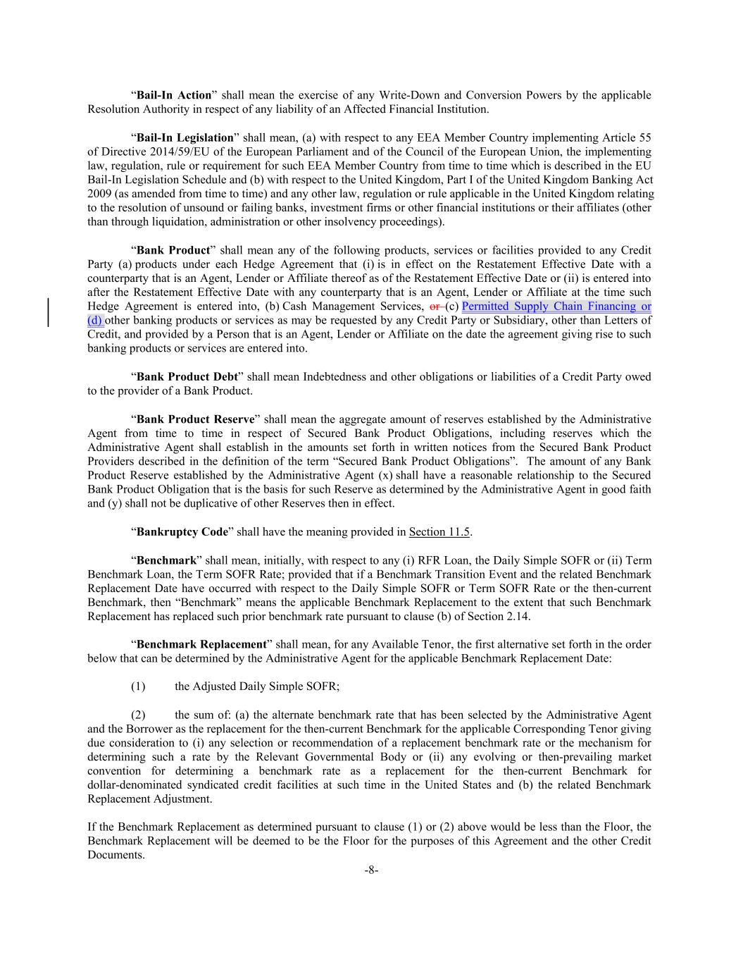 “Bail-In Action” shall mean the exercise of any Write-Down and Conversion Powers by the applicable Resolution Authority in respect of any liability of an Affected Financial Institution. “Bail-In Legislation” shall mean, (a) with respect to any EEA Member Country implementing Article 55 of Directive 2014/59/EU of the European Parliament and of the Council of the European Union, the implementing law, regulation, rule or requirement for such EEA Member Country from time to time which is described in the EU Bail-In Legislation Schedule and (b) with respect to the United Kingdom, Part I of the United Kingdom Banking Act 2009 (as amended from time to time) and any other law, regulation or rule applicable in the United Kingdom relating to the resolution of unsound or failing banks, investment firms or other financial institutions or their affiliates (other than through liquidation, administration or other insolvency proceedings). “Bank Product” shall mean any of the following products, services or facilities provided to any Credit Party (a) products under each Hedge Agreement that (i) is in effect on the Restatement Effective Date with a counterparty that is an Agent, Lender or Affiliate thereof as of the Restatement Effective Date or (ii) is entered into after the Restatement Effective Date with any counterparty that is an Agent, Lender or Affiliate at the time such Hedge Agreement is entered into, (b) Cash Management Services, or (c) Permitted Supply Chain Financing or (d) other banking products or services as may be requested by any Credit Party or Subsidiary, other than Letters of Credit, and provided by a Person that is an Agent, Lender or Affiliate on the date the agreement giving rise to such banking products or services are entered into. “Bank Product Debt” shall mean Indebtedness and other obligations or liabilities of a Credit Party owed to the provider of a Bank Product. “Bank Product Reserve” shall mean the aggregate amount of reserves established by the Administrative Agent from time to time in respect of Secured Bank Product Obligations, including reserves which the Administrative Agent shall establish in the amounts set forth in written notices from the Secured Bank Product Providers described in the definition of the term “Secured Bank Product Obligations”. The amount of any Bank Product Reserve established by the Administrative Agent (x) shall have a reasonable relationship to the Secured Bank Product Obligation that is the basis for such Reserve as determined by the Administrative Agent in good faith and (y) shall not be duplicative of other Reserves then in effect. “Bankruptcy Code” shall have the meaning provided in Section 11.5. “Benchmark” shall mean, initially, with respect to any (i) RFR Loan, the Daily Simple SOFR or (ii) Term Benchmark Loan, the Term SOFR Rate; provided that if a Benchmark Transition Event and the related Benchmark Replacement Date have occurred with respect to the Daily Simple SOFR or Term SOFR Rate or the then-current Benchmark, then “Benchmark” means the applicable Benchmark Replacement to the extent that such Benchmark Replacement has replaced such prior benchmark rate pursuant to clause (b) of Section 2.14. “Benchmark Replacement” shall mean, for any Available Tenor, the first alternative set forth in the order below that can be determined by the Administrative Agent for the applicable Benchmark Replacement Date: (1) the Adjusted Daily Simple SOFR; (2) the sum of: (a) the alternate benchmark rate that has been selected by the Administrative Agent and the Borrower as the replacement for the then-current Benchmark for the applicable Corresponding Tenor giving due consideration to (i) any selection or recommendation of a replacement benchmark rate or the mechanism for determining such a rate by the Relevant Governmental Body or (ii) any evolving or then-prevailing market convention for determining a benchmark rate as a replacement for the then-current Benchmark for dollar-denominated syndicated credit facilities at such time in the United States and (b) the related Benchmark Replacement Adjustment. If the Benchmark Replacement as determined pursuant to clause (1) or (2) above would be less than the Floor, the Benchmark Replacement will be deemed to be the Floor for the purposes of this Agreement and the other Credit Documents. -8-
